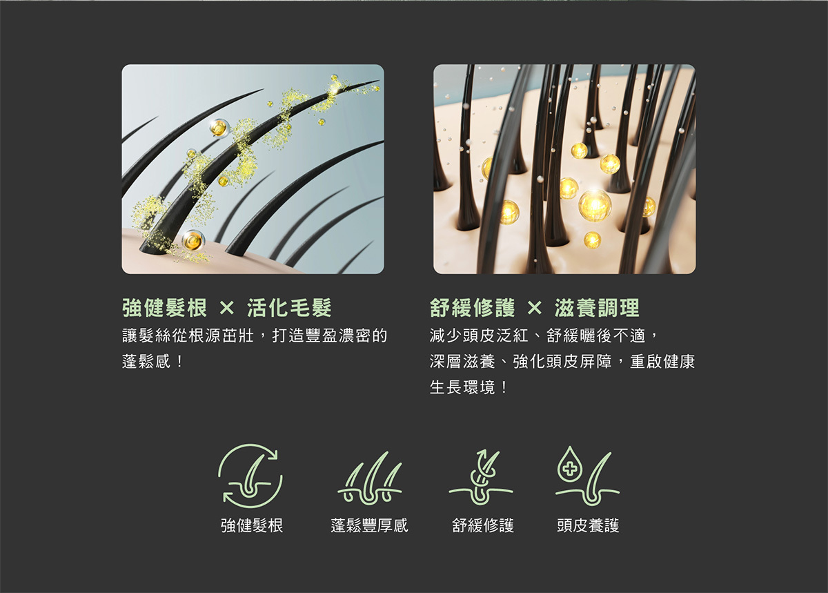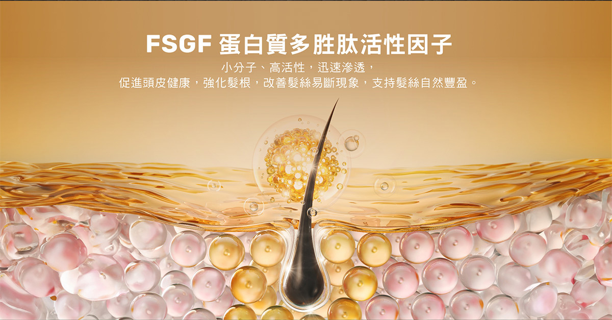 獨家 FSGF 蛋白質多胜肽活性因子 小分子、高活性,迅速滲透,喚醒沉睡毛囊,強健髮根、減少落髮,重啟濃密生長力!