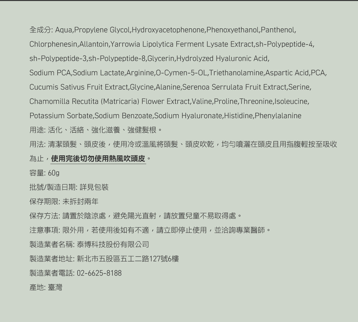 用法:清潔頭髮、頭皮後,使用冷或溫風將頭髮、頭皮吹乾,均勻噴灑在頭皮且用指腹輕按至吸收為止,使用完後切勿使用熱風吹頭皮。