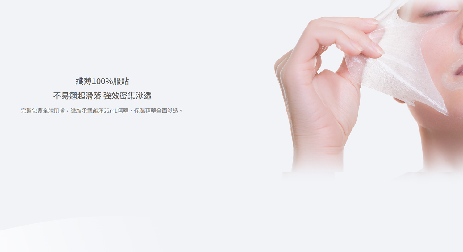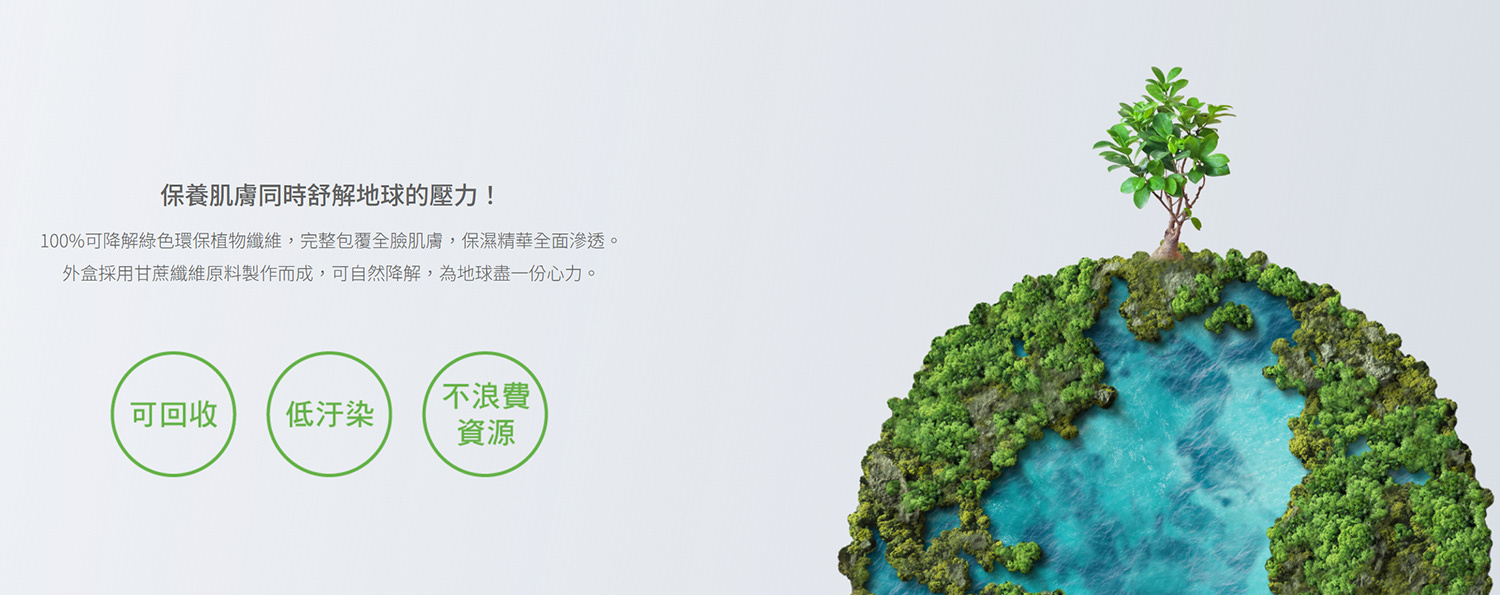 100%可降解綠色環保植物纖維,完整包覆全臉肌膚,纖維承載飽滿22mL精華,保濕精華全面滲透。