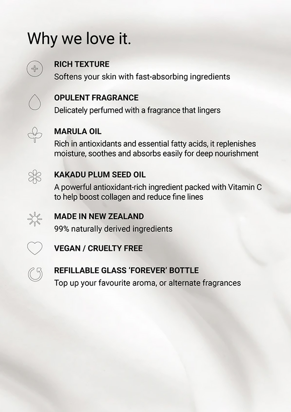 蘊含 富含維生素的卡卡杜李油和馬魯拉油。馬魯拉油功效全面,既具有抗發炎作用,又富含強效抗氧化劑,包括維生素C、維生素E、必需胺基酸和類黃酮。這些抗氧化劑以及omega 6和omega 9脂肪酸,能夠補充水分,減少泛紅現象。其高含量的必需脂肪酸成分也與皮膚表層成分相似,以達到最佳吸收。