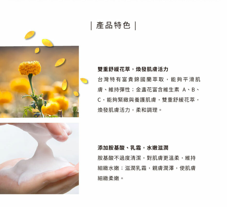 • 台灣富貴錦國蘭、有機鮮採金盞花,雙重舒緩花萃,煥發肌膚活力