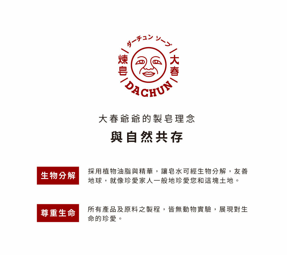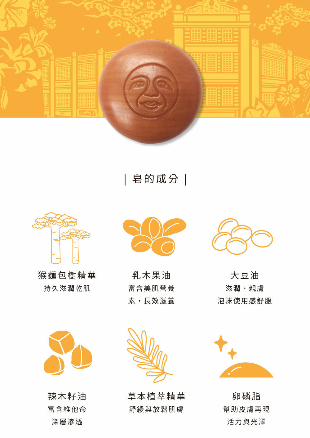 成分:棕櫚油、棕櫚核仁油、辣木籽油、有機乳木果油、大豆油、卵磷脂、猴麵包樹籽精華、草本植萃精華