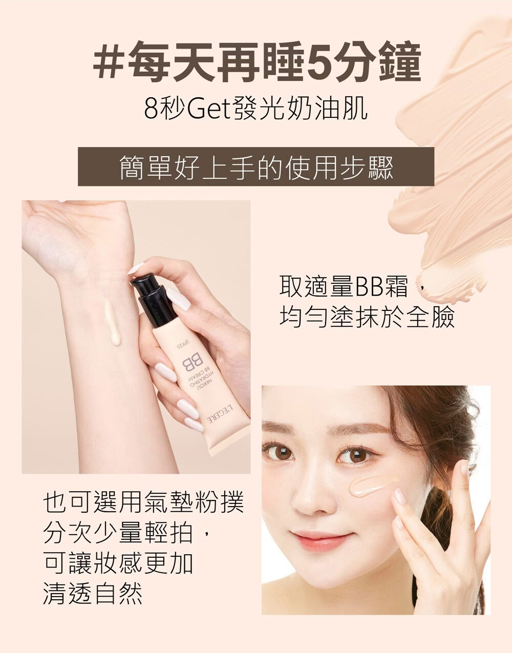使用方法: 取適量BB霜並均勻塗抹於全臉。也可選用氣墊粉撲分次少量輕拍,可讓妝感更顯薄透自然。※單獨使用時,也請使用一般卸妝產品卸除。