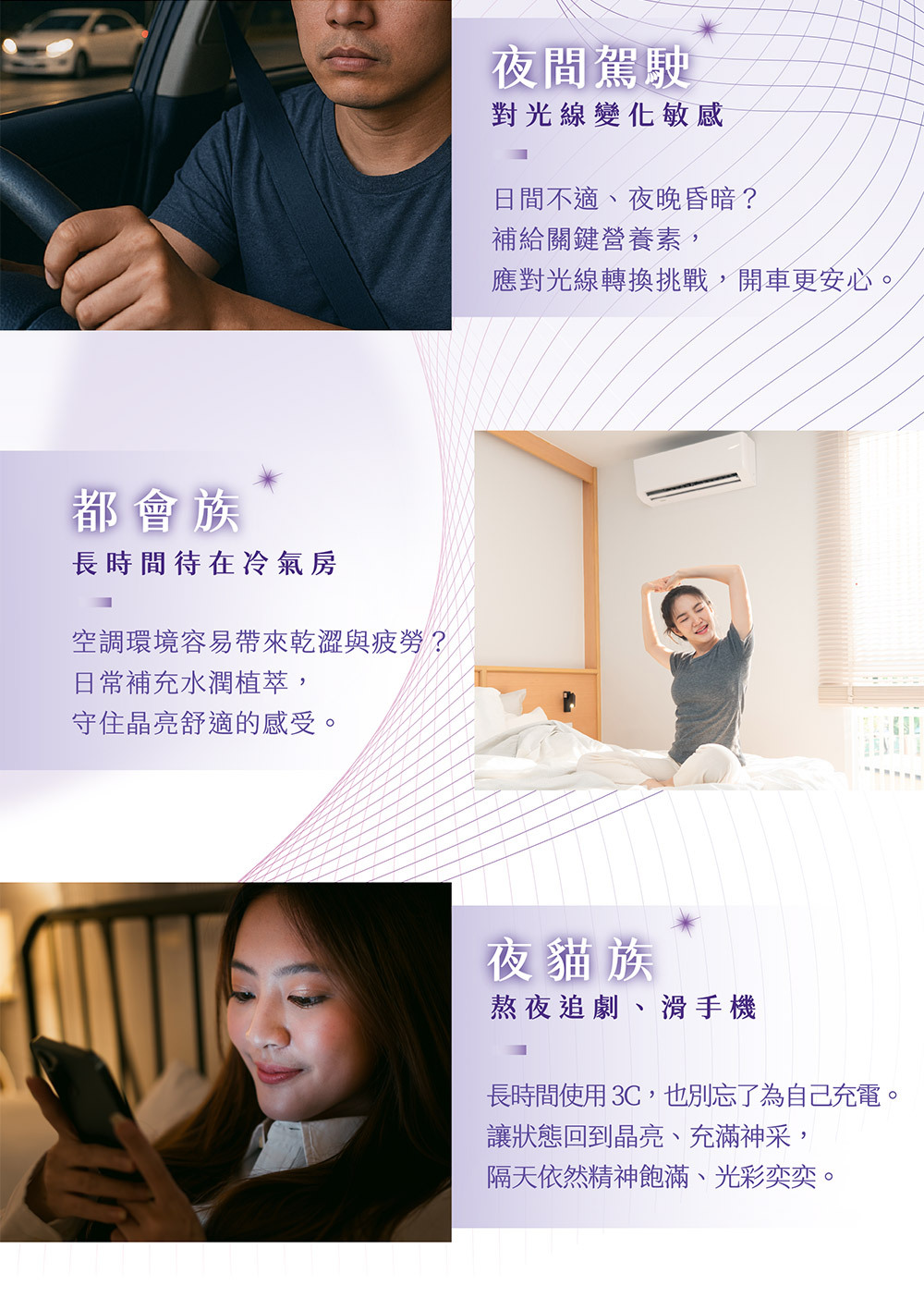 如演唱會愛好者、3C重度使用者、熬夜族、夜間駕駛、都會族