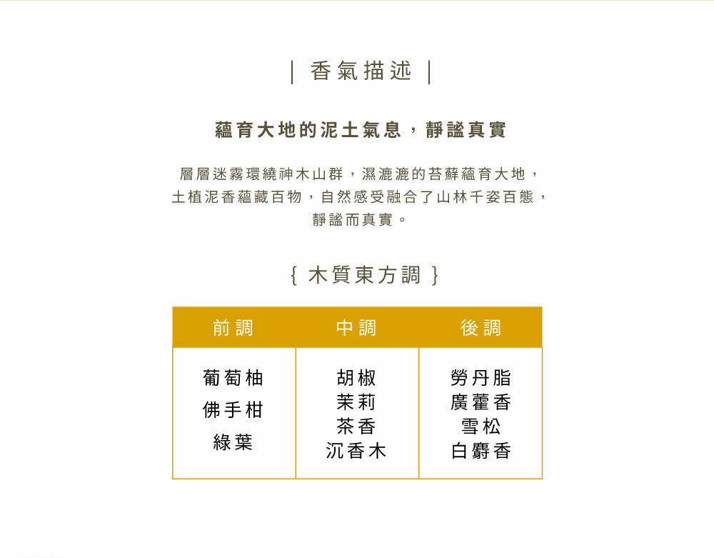 • 煙燻的泥土氣息,如同走入靜謐大地,充滿厚實的安全感"