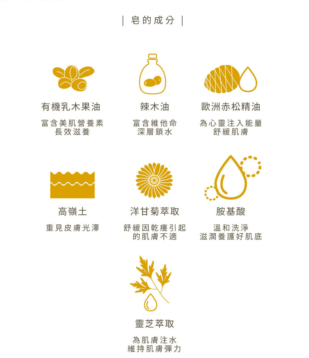 成分:棕櫚油、棕櫚核仁油、甘油、辣木油、有機乳木果油、荷荷芭酯、胺基酸、高嶺土、歐洲赤松精油、靈芝萃取、洋甘菊萃取