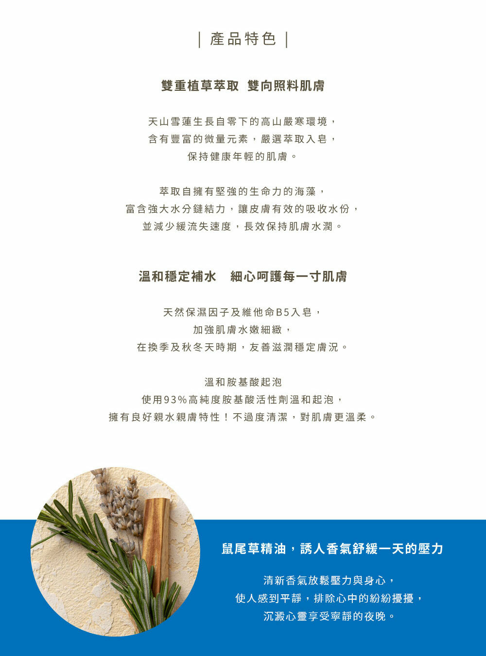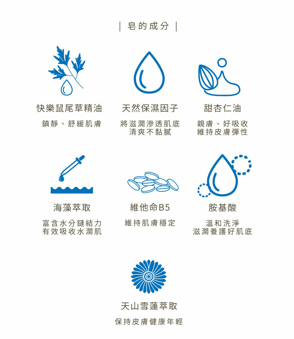 成分:棕櫚油、棕櫚核仁油、甘油、甜杏仁油、荷荷芭酯、胺基酸、快樂鼠尾草精油、天然保濕因子、維他命B5、天山雪蓮萃取、海藻萃取