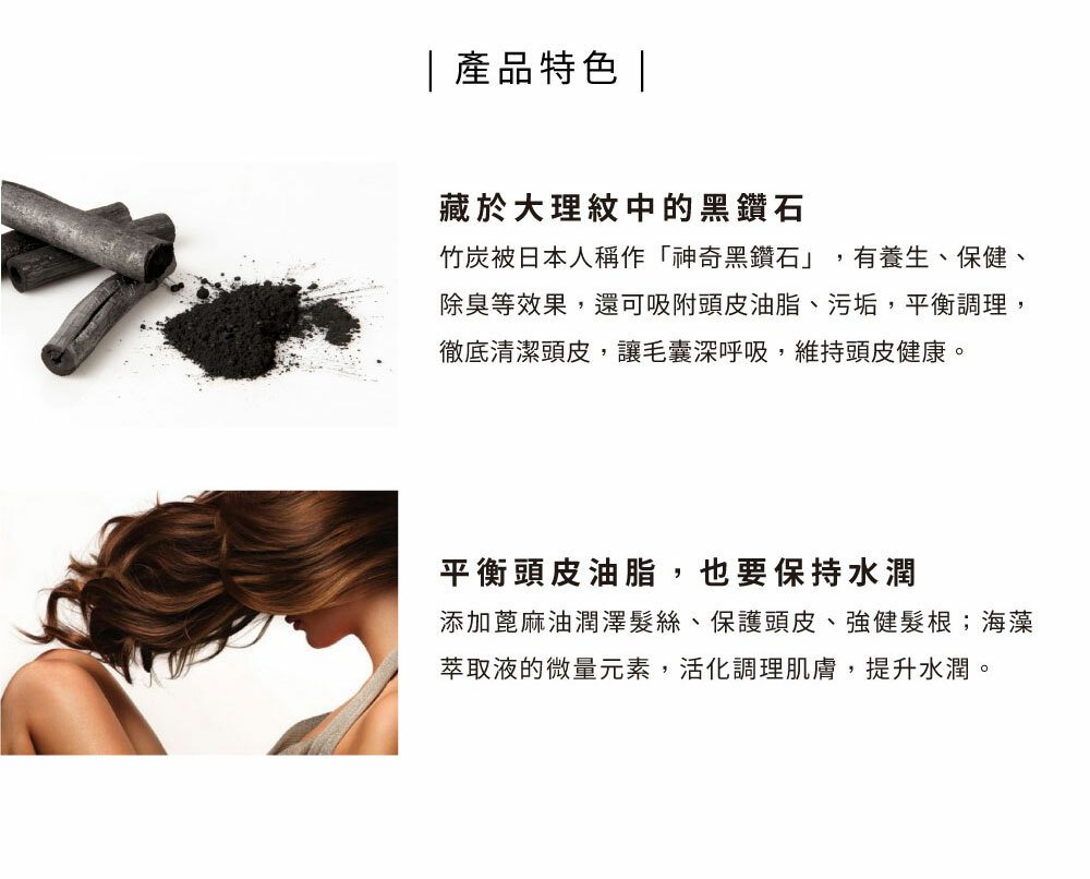 • 竹炭吸附油脂,平衡調理,讓頭皮深呼吸