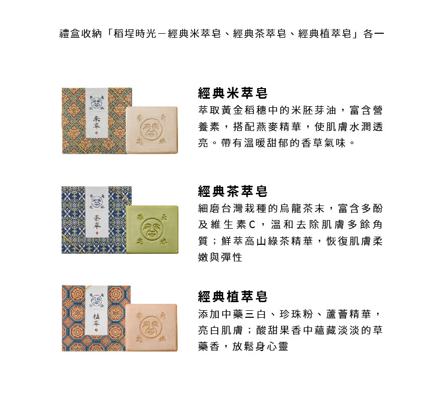 禮盒內容:經典米萃皂、經典茶萃皂、經典植萃皂