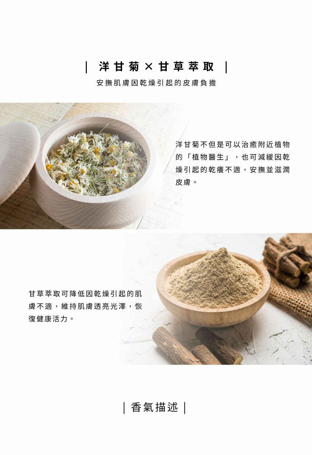 • 添加洋甘菊、甘草萃取,減緩肌膚乾燥引起的不適
