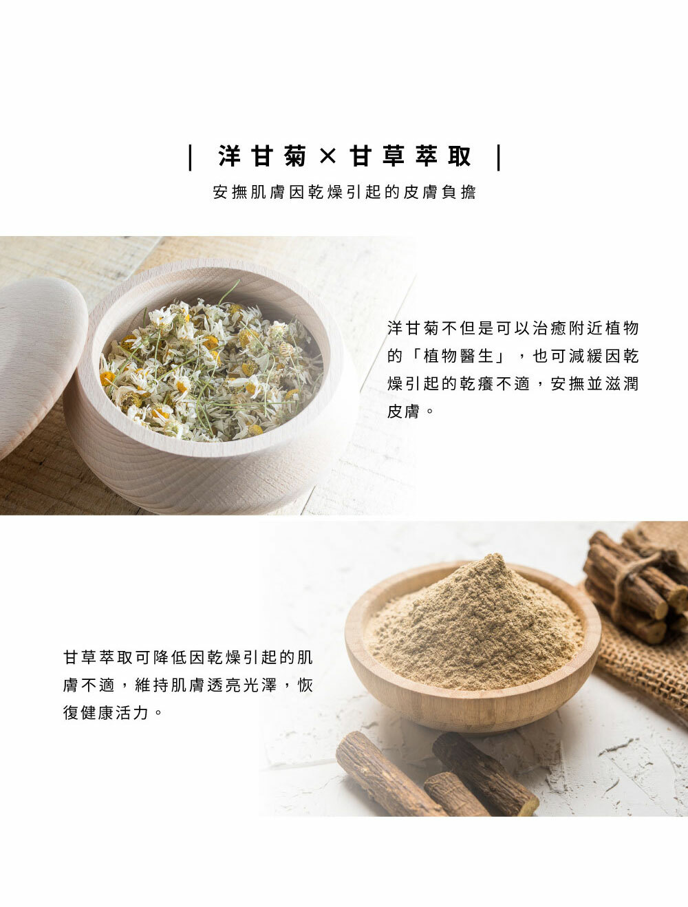 • 添加洋甘菊、甘草萃取,減緩肌膚乾燥引起的不適