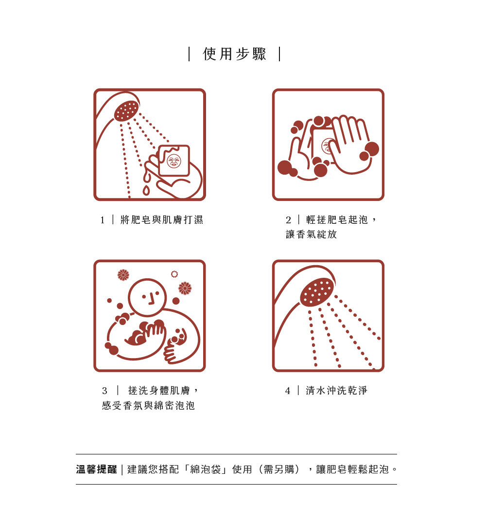 成分:棕櫚油、棕櫚核仁油、米胚芽油、有機乳木果油、酪梨油、靈芝萃取