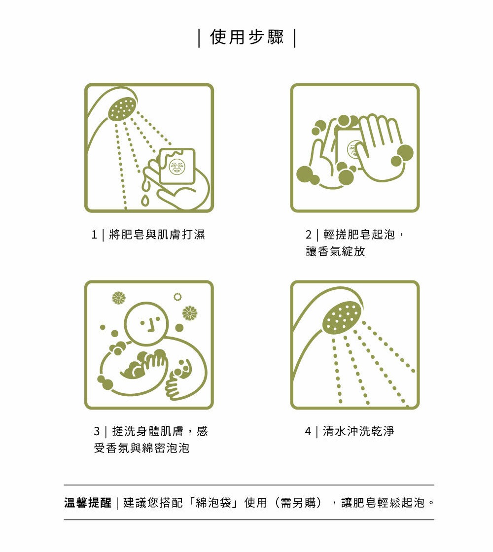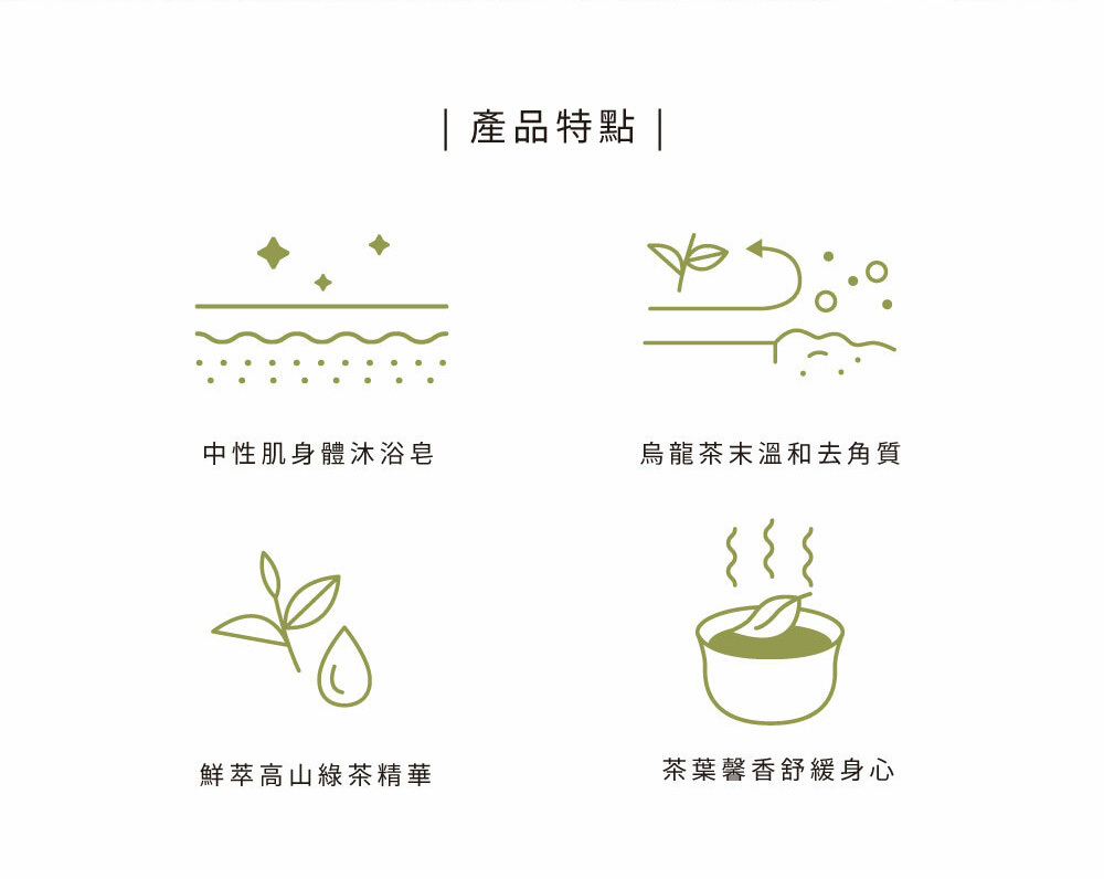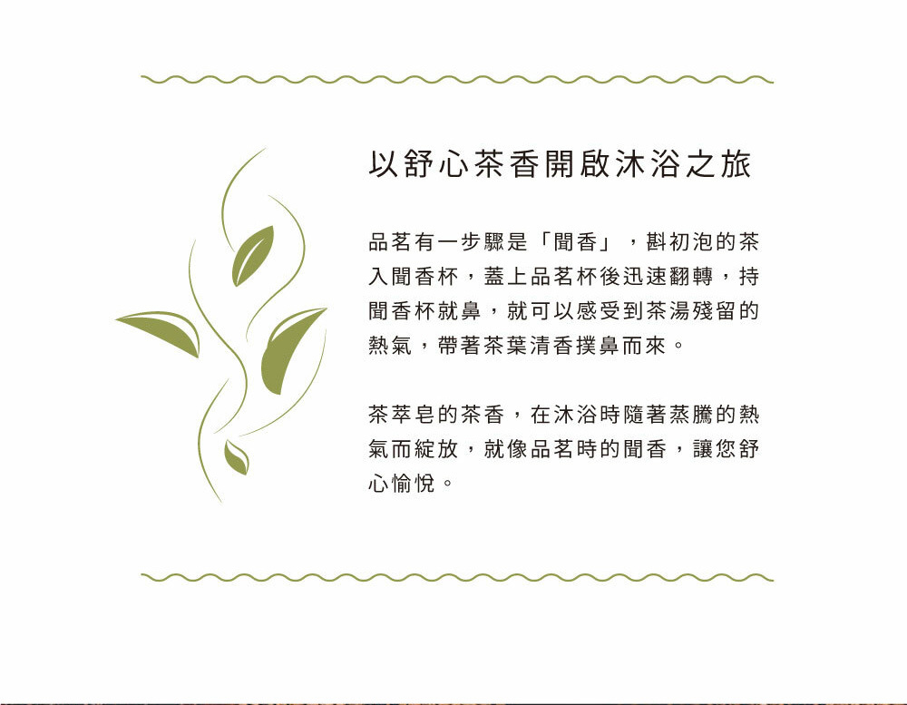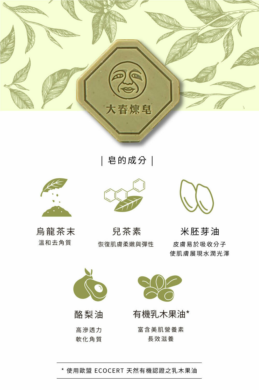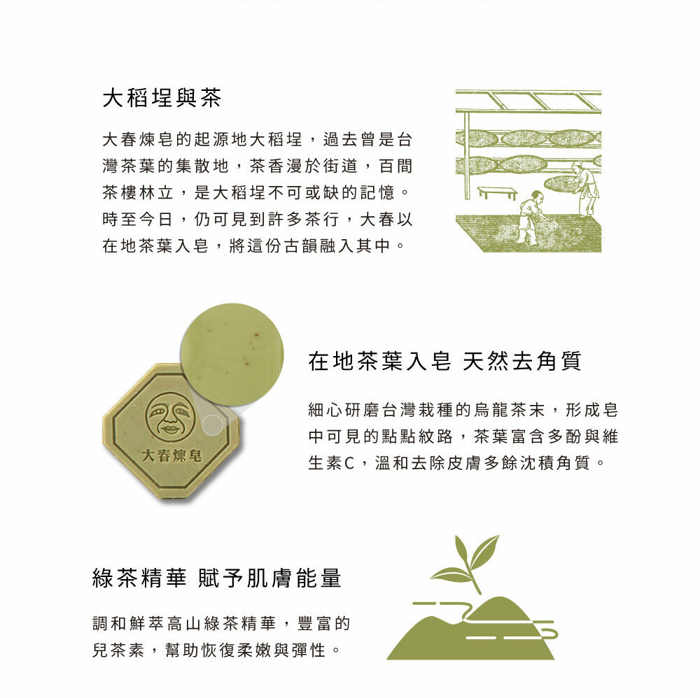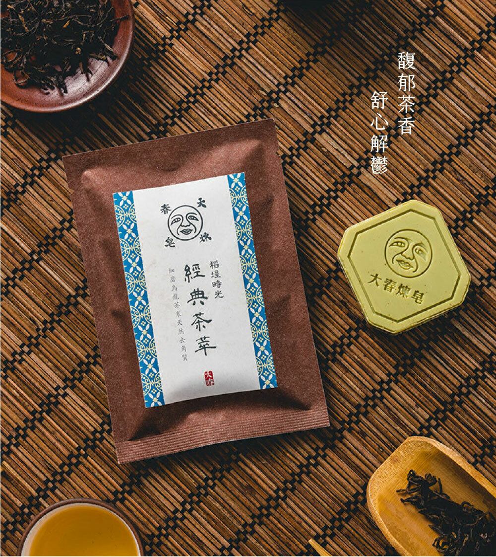 • 以大稻埕在地材料入皂,細磨台灣栽種的烏龍茶末,溫和去角質