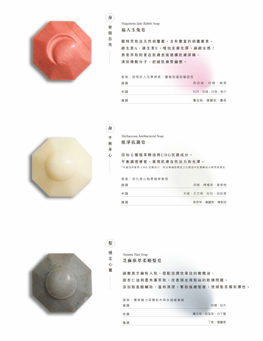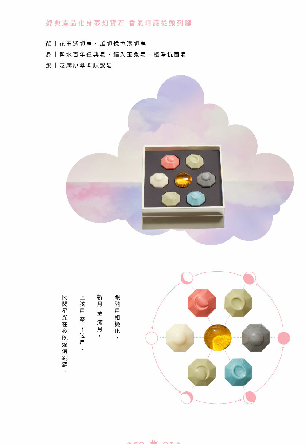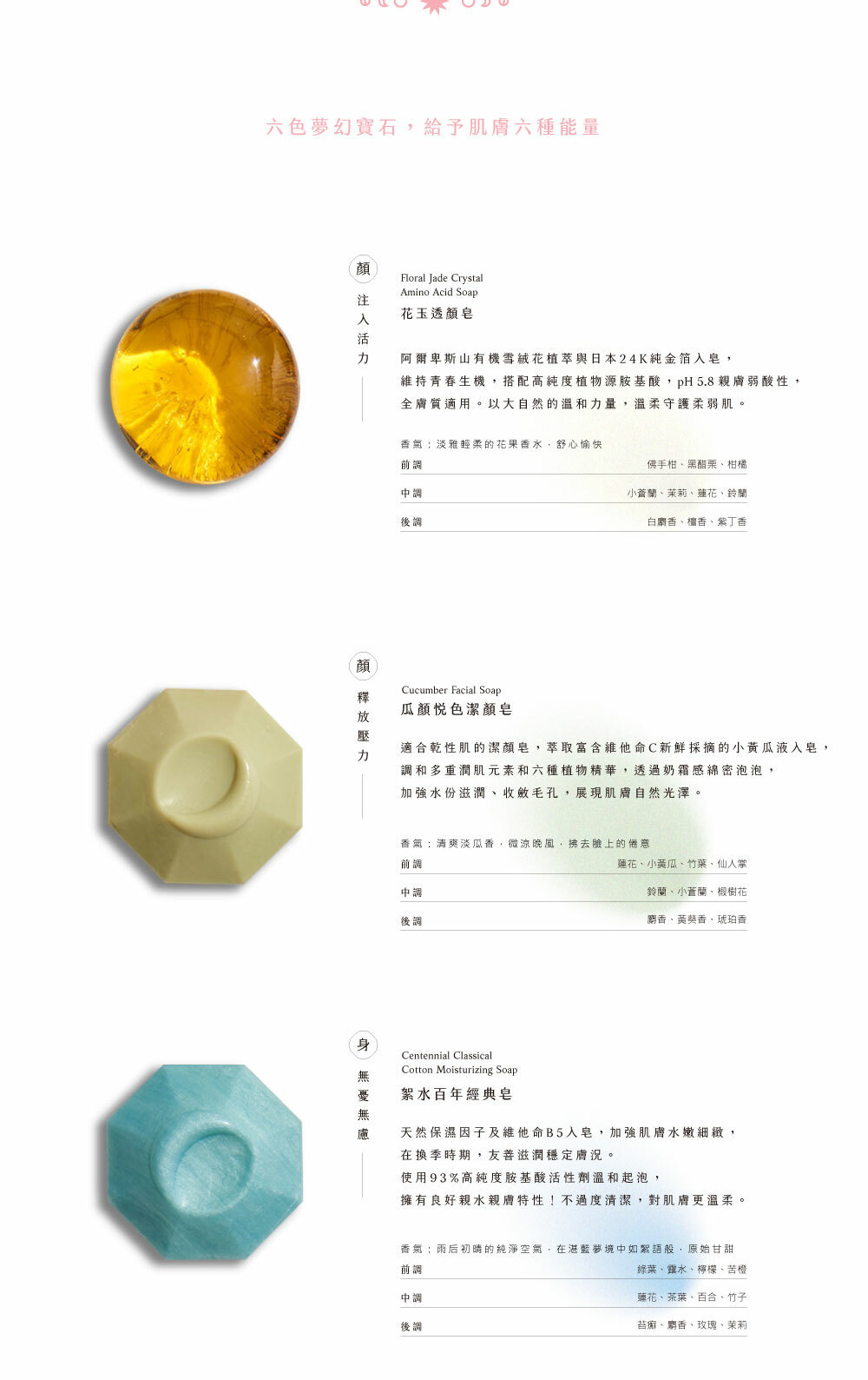 禮盒內容:花玉透顏皂、瓜顏悅色潔顏皂、絮水百年經典皂、福入玉兔皂、植淨抗菌皂、芝麻原萃柔順髮皂,各一入