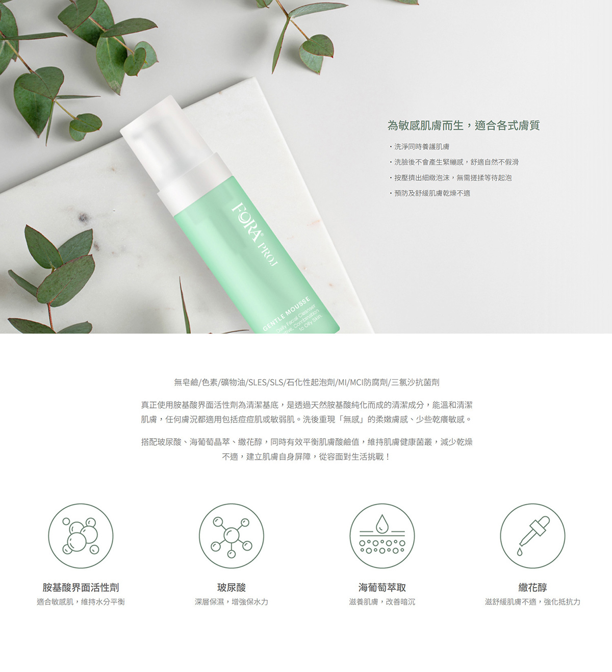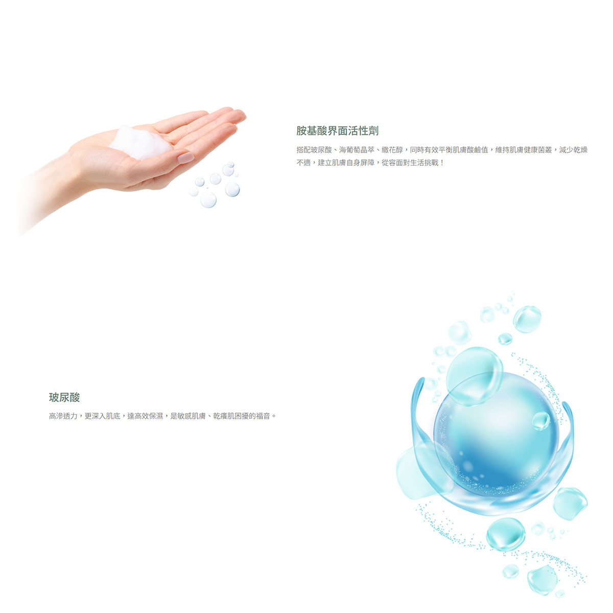 真正使用胺基酸界面活性劑為清潔基底,是透過天然胺基酸純化而成的清潔成分,能溫和清潔肌膚,任何膚況都適用包括痘痘肌或敏弱肌。