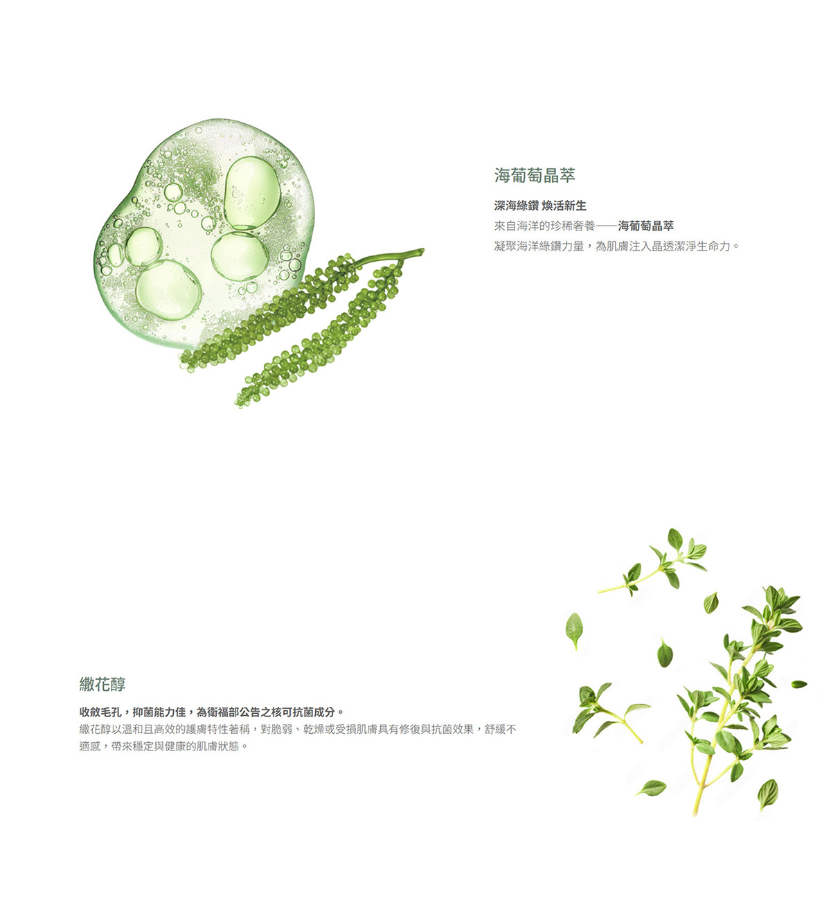 全成分:‧臺灣海域海葡萄: 珍貴海洋多醣體,有效保濕及修復皮膚屏障 ‧澳洲珍稀塔斯馬尼亞胡椒莓: 溫和調理肌膚,舒緩乾燥不適,保持肌膚水嫩健康 ‧鎖水磁石: 有助於滋養肌膚,提供長效保濕,提升肌膚水潤感 Water, Glycerin, TEA-Cocoyl Alaninate, Lauramidopropyl Betaine, Sodium Chloride, 1,2-Hexanediol, Glycosyl Trehalose, Butylene Glycol , Hydrogenated Starch Hydrolysate, Saccharide Isomerate, Niacinamide, Phenoxyethanol, Chlorphenesin, Betaine, D-PANTHENOL, Sodium Hyaluronate, Disodium EDTA, Fragrance, o-Cymen-5-ol, Sodium PCA, Hydroxyacetophenone, Dipropylene Glycol, Tasmannia Lanceolata Fruit/Leaf Extract, Sodium Lactate, Caprylyl Glycol, PCA, Serine, Alanine, Citric Acid, Sodium Citrate, Caulerpa Lentillifera Extract, Glycine, Glutamic Acid, Lysine HCl, Threonine, Arginine, Proline, Dipotassium Glycyrrhizate