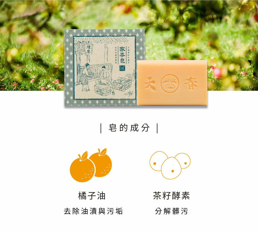 成分:棕櫚油、棕櫚核仁油、橘子油、茶籽酵素、佛手柑精油、甜橙精油、尤加利精油、迷迭香精油、檸檬香茅精油、絲柏精油