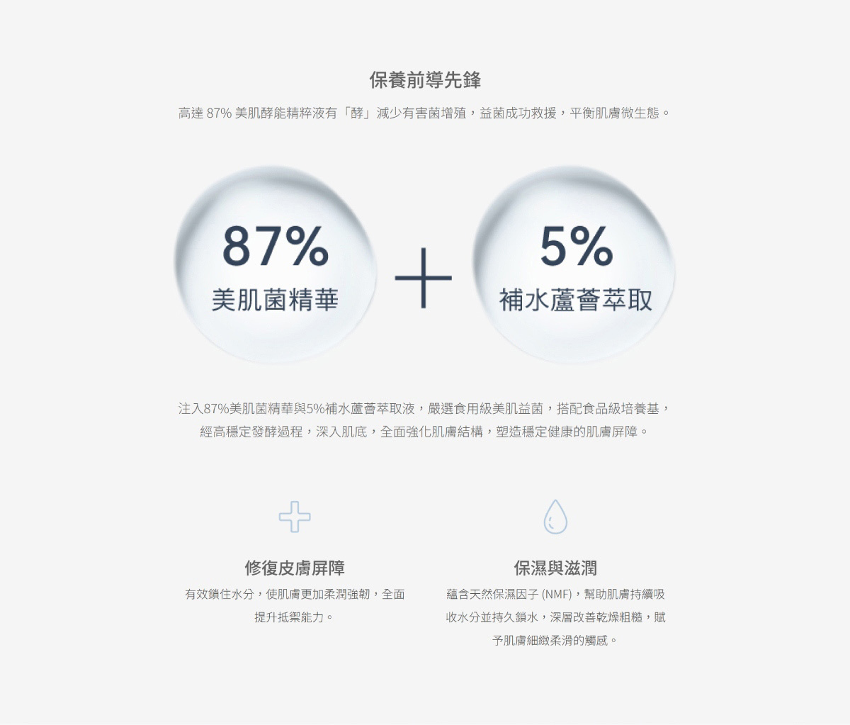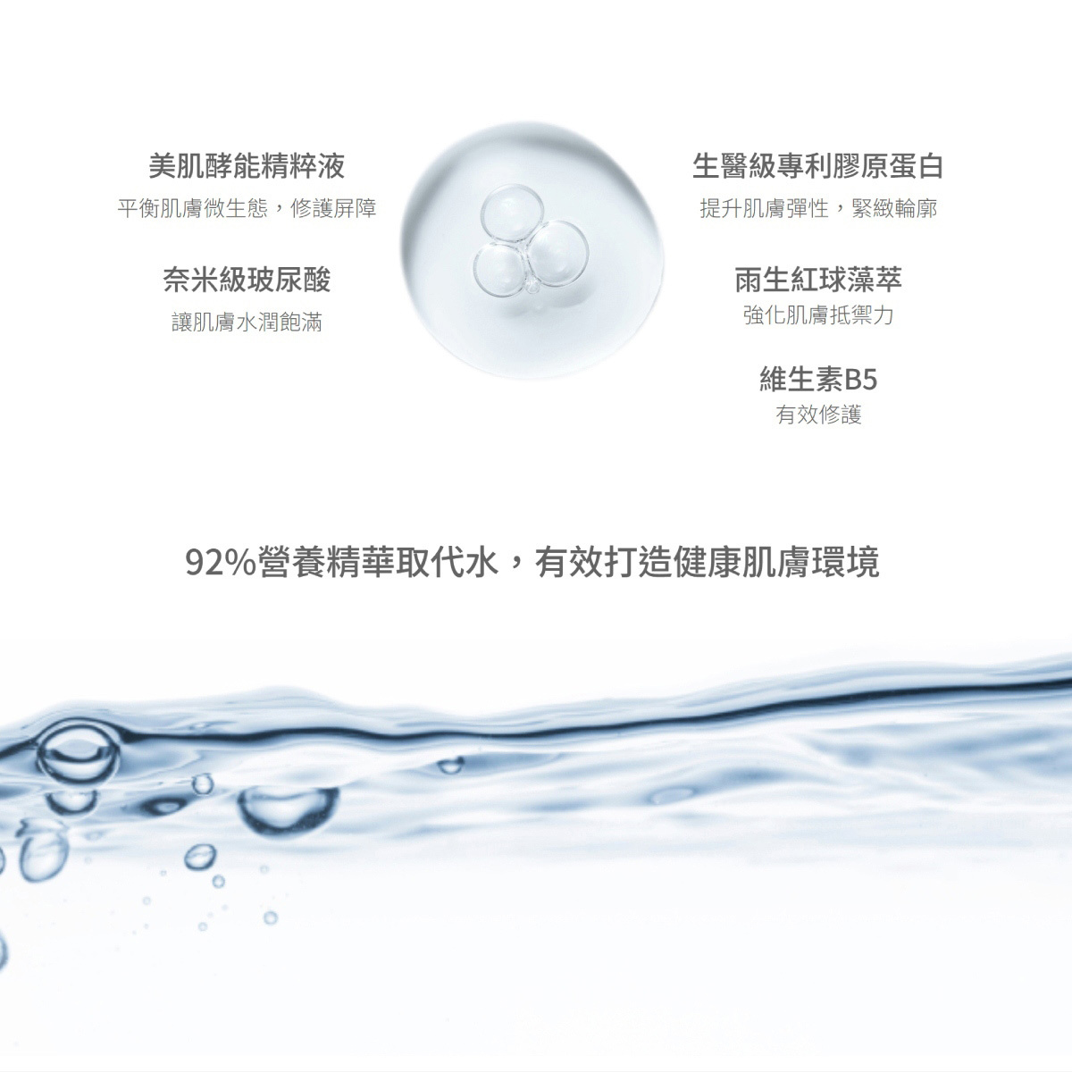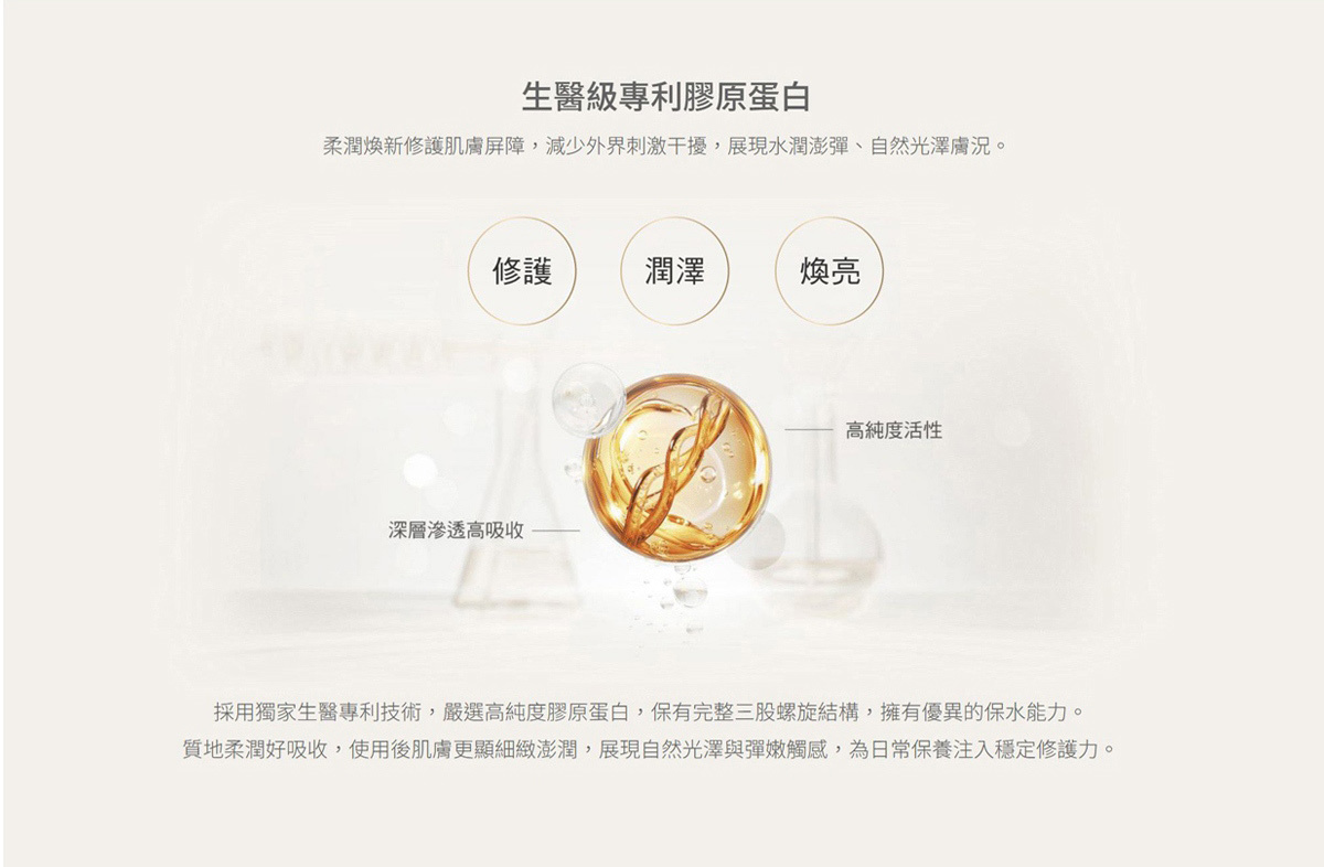 保養前導先鋒,高達 87% 美肌酵能精粹液有「酵」減少有害菌增殖,益菌成功救援,平衡肌膚微生態,輕透水感質地,有效平衡油脂分泌,提升保養品的吸收效率,水潤飽滿。高濃度精華露,補充生醫級專利膠原蛋白,提升肌膚彈性,緊緻輪廓。