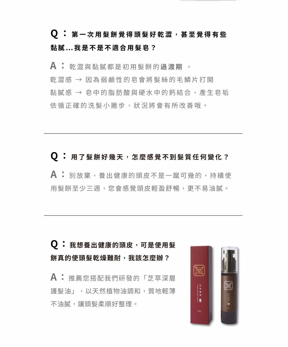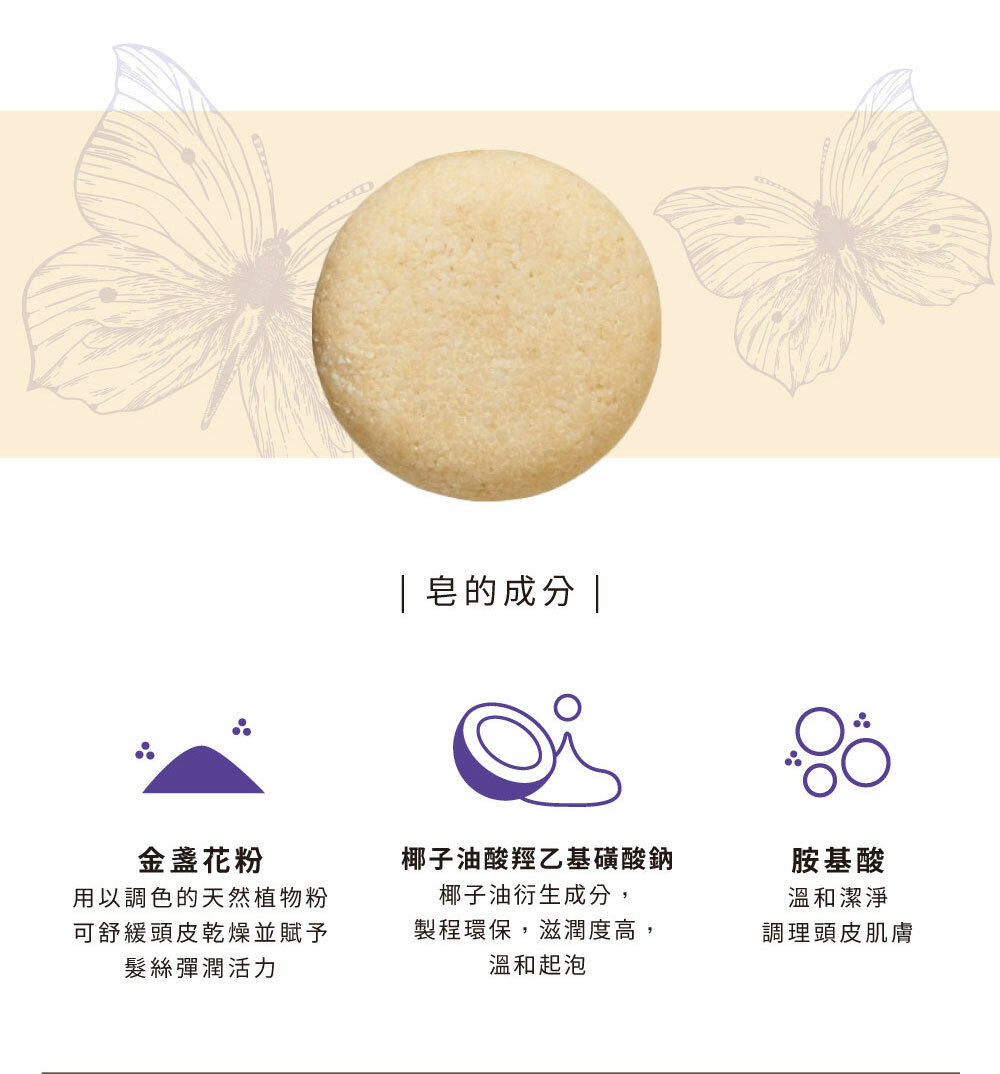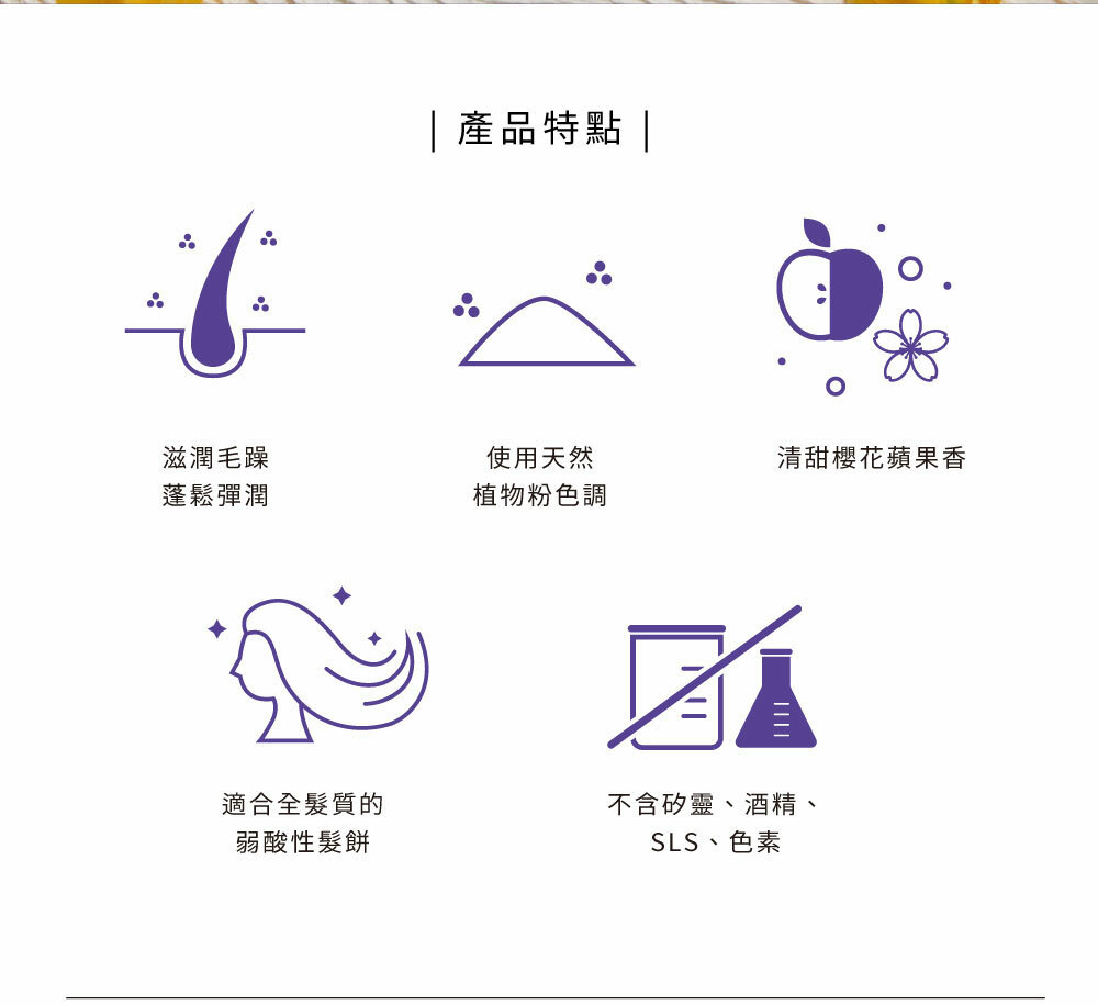• 適合全髮質的弱酸性髮餅,給予頭皮零負擔