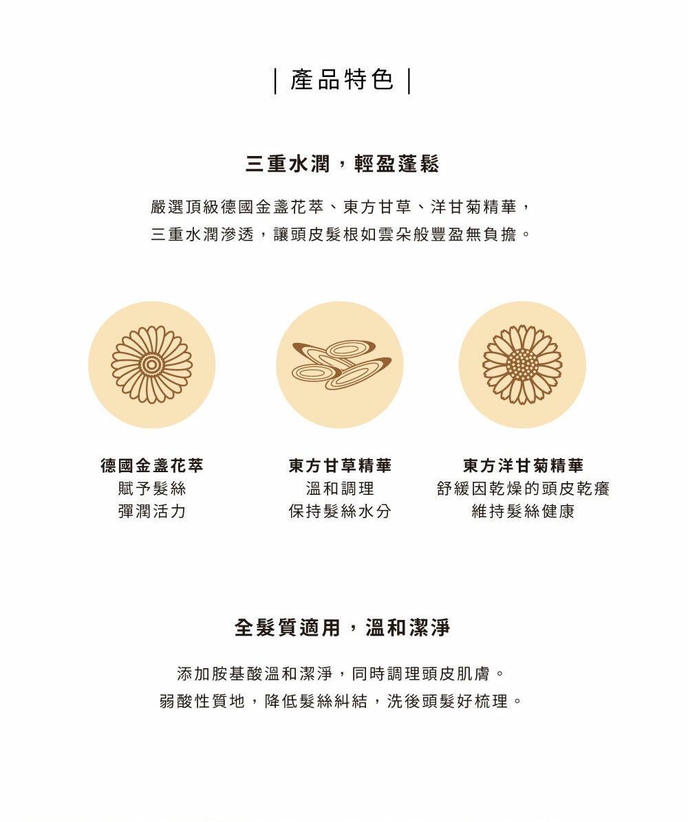 • 嚴選頂級德國金盞花萃、東方甘草、洋甘菊精華,水潤滲透毛躁髮質,使頭髮輕盈蓬鬆