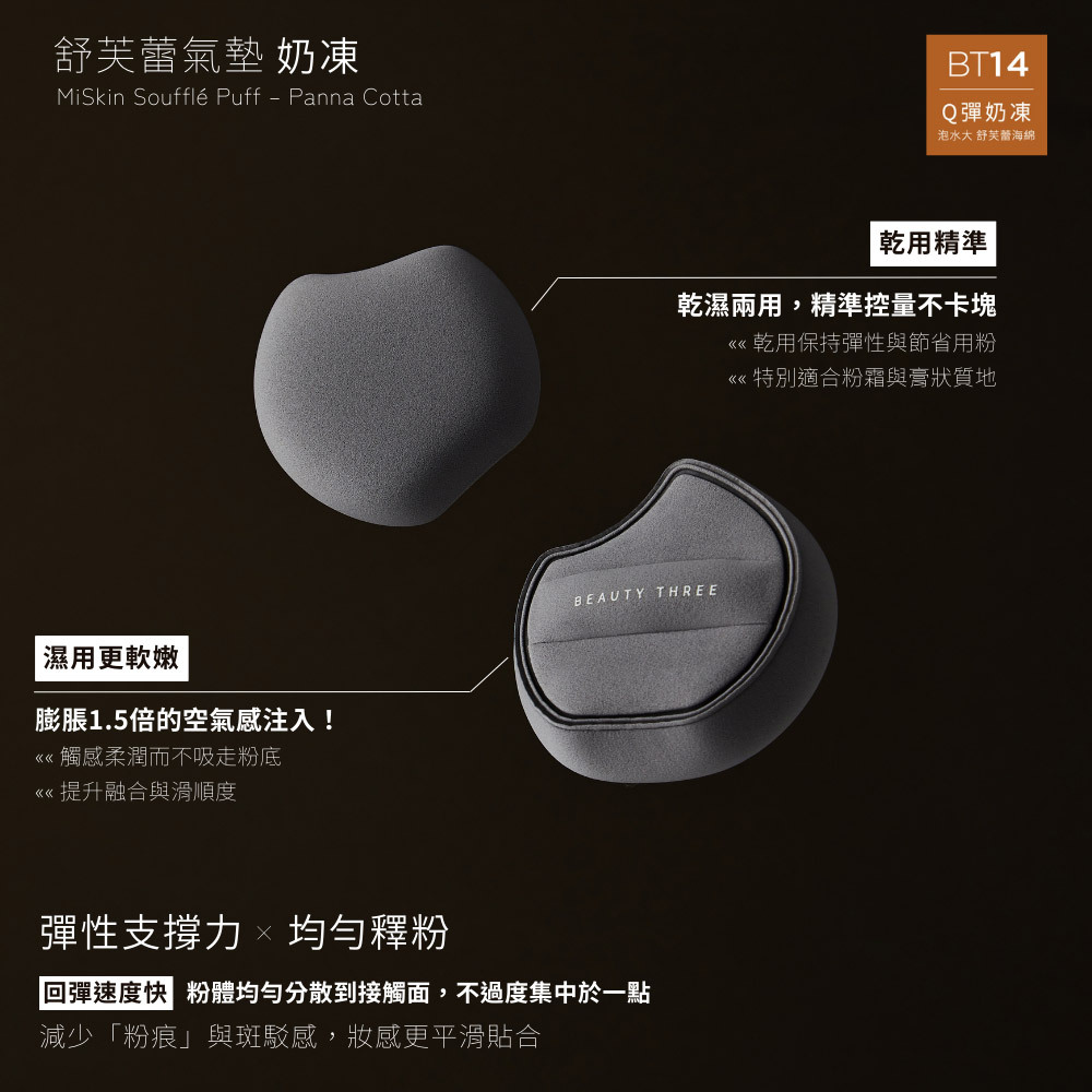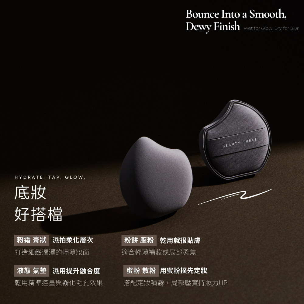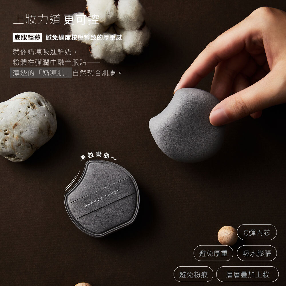 Q彈觸感乾濕兩用,吸水後更膨鬆軟嫩,從液態粉底到粉霜皆能均勻服貼。
