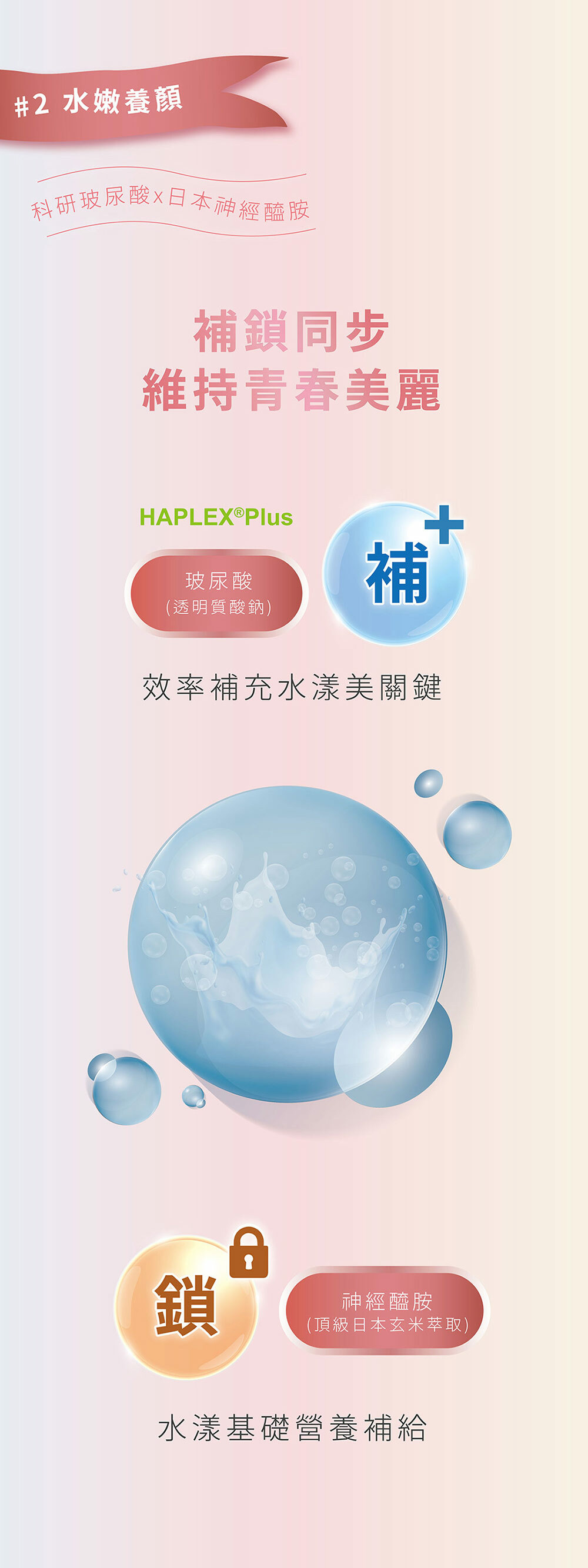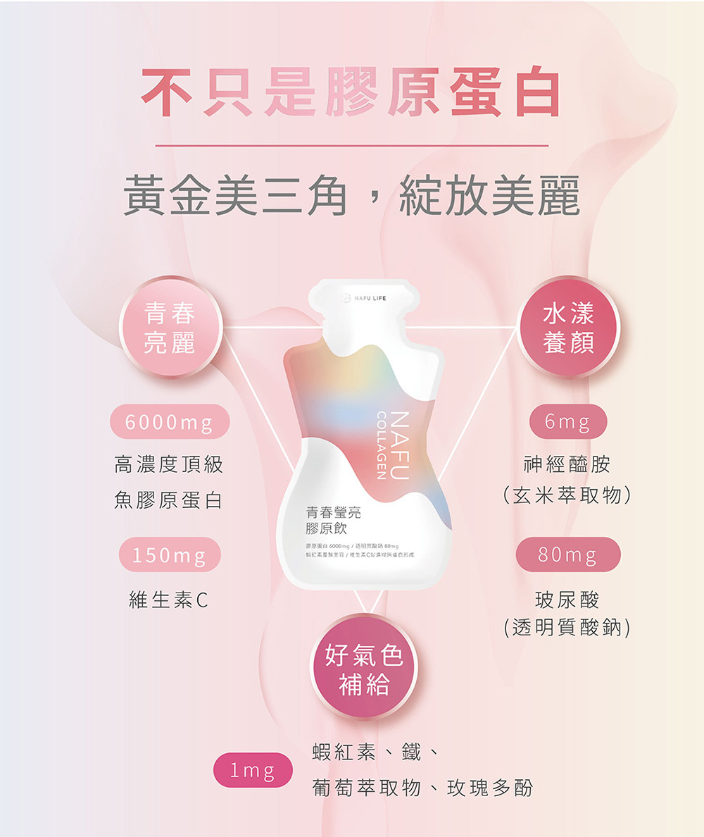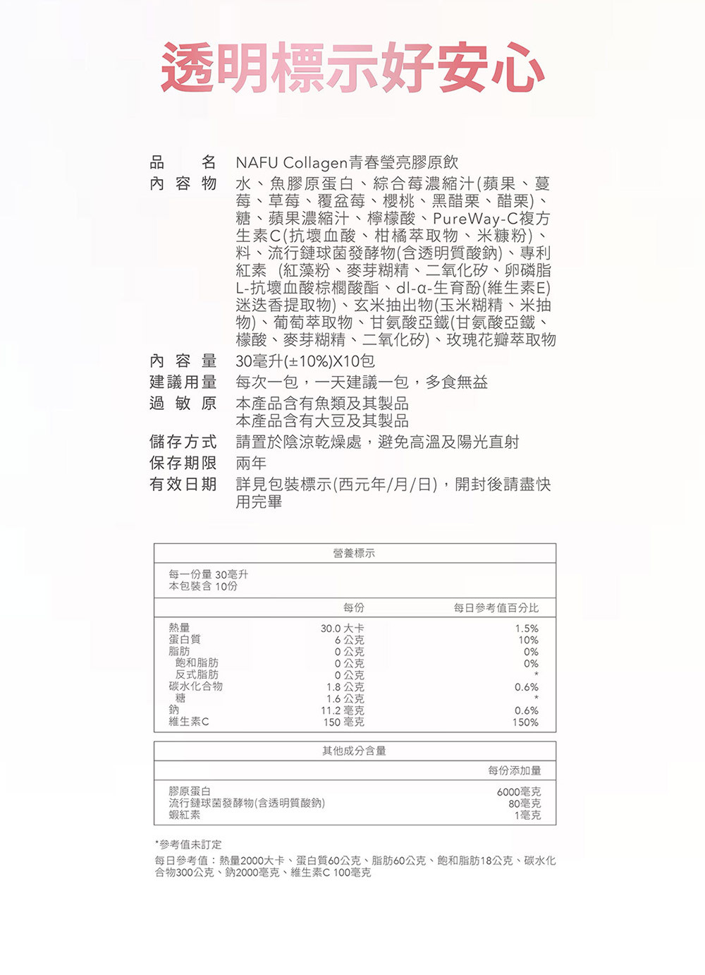 水、魚膠原蛋白、綜合莓濃縮汁(蘋果、蔓 莓、草莓、覆盆莓、櫻桃、黑醋栗、醋栗) 糖、蘋果濃縮汁、檸檬酸、urWay-C複方 生素C(抗壞血酸、柑橘萃取物、米粉)、 料、流行鏈球菌發酵物(含透明質酸鈉)、專利 紅素(紅藻粉麥芽糊精、氧化、卵磷脂 L-抗壞血酸棕櫚酸酯、d-a-生育酚(維生素E) 迷迭香提取物)、米抽出物(玉米糊精、米抽 物)、葡萄萃取物、甘氨鐵(甘氨酸鐵 檬酸、麥芽糊精、二氧化矽)、玫瑰花瓣萃取物 。