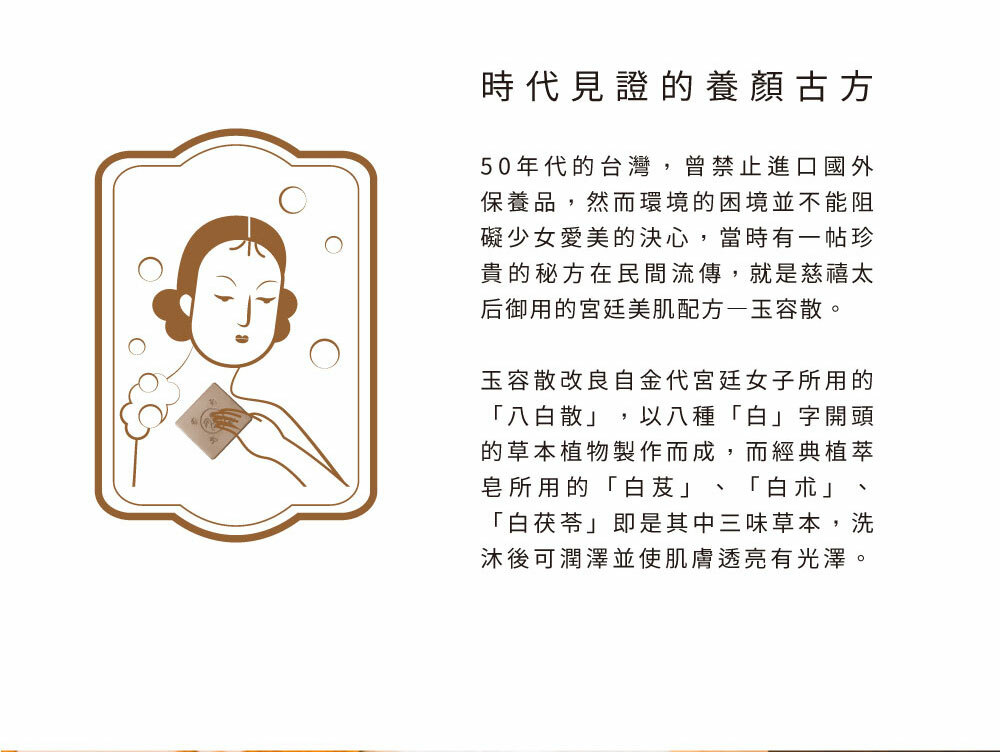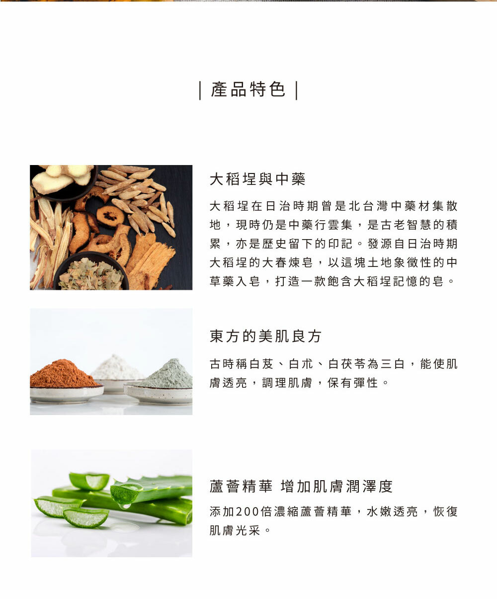 * 以大稻埕在地材料入皂,添加草本漢方三白:白茯苓、白朮、白芨與蘆薈精華調和成美肌良方,讓肌膚白皙透亮