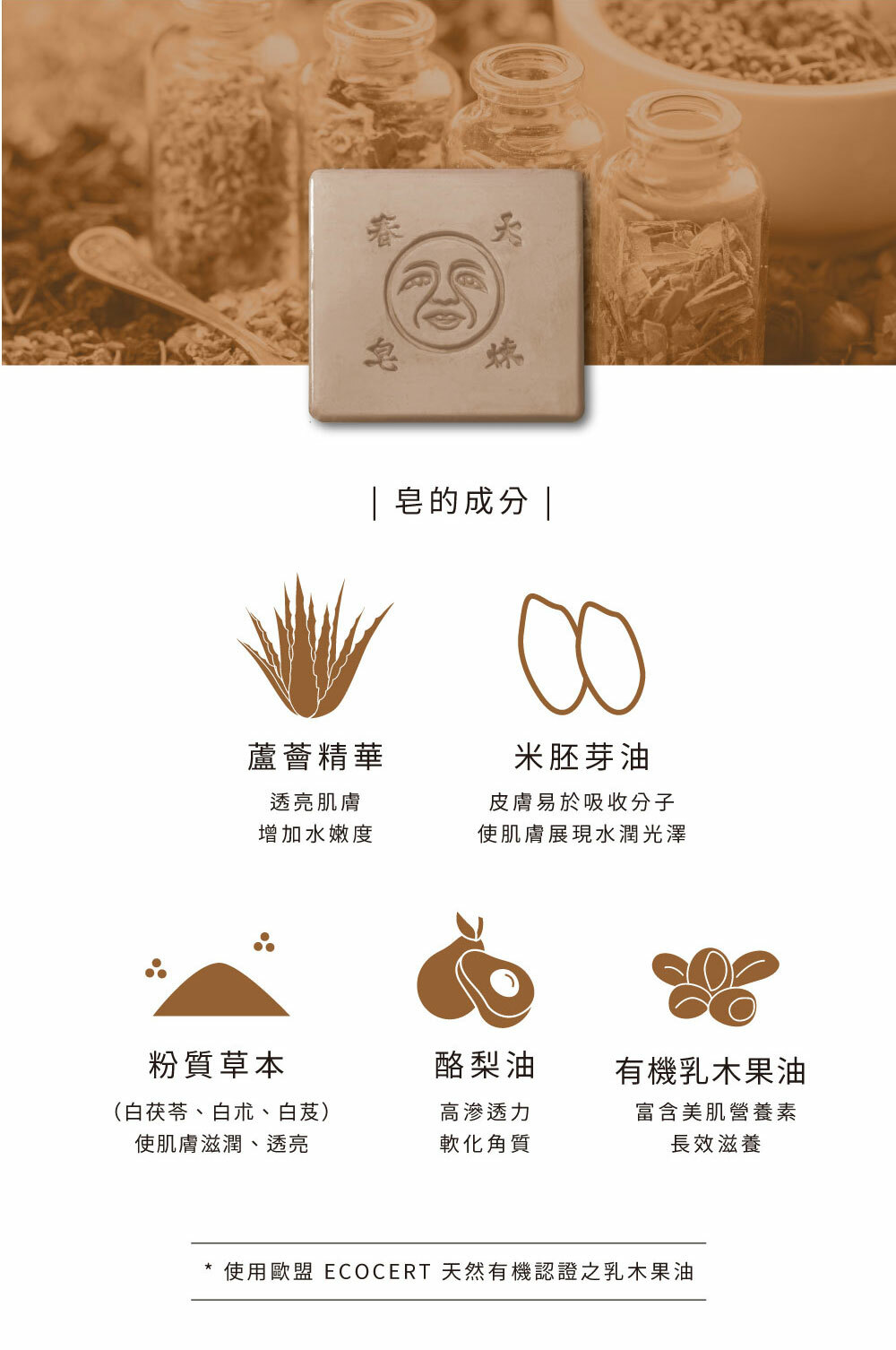 成分:棕櫚油、棕櫚核仁油、米胚芽油、有機乳木果油、酪梨油、中藥粉(白茯苓、白朮、白芨)、甜橙精油、葡萄柚精油、佛手柑精油、花梨木精油、苦橙精油、蘆薈精華