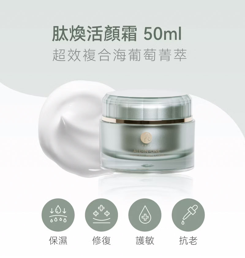All-In-One 高濃度明星成分萃取修護,添加修復抗老活性胜肽、保濕舒敏海葡萄菁萃、高滲透型神經醯胺撫紋延緩肌膚老化,使肌膚緊緻無痕、澎彈透亮。