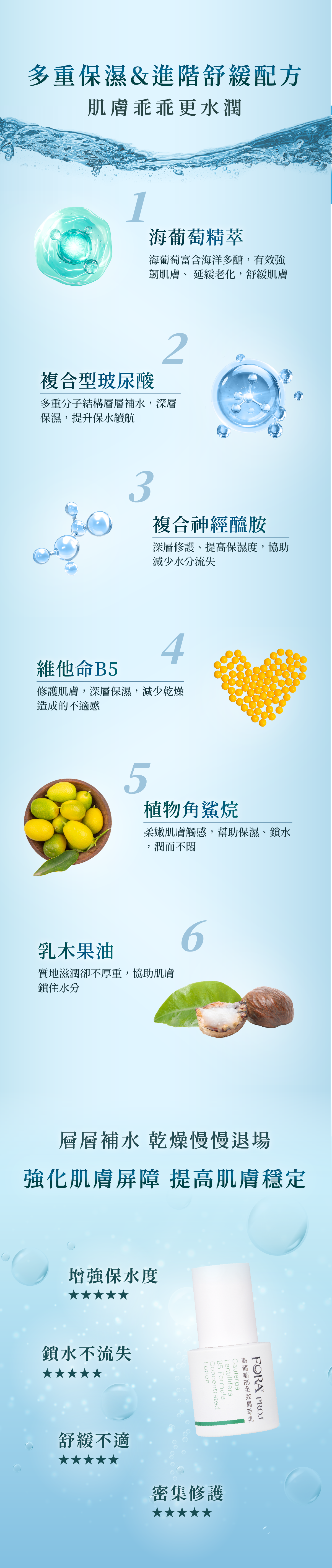 內容物名稱:海葡萄萃取、複合型神經醯胺、植物角鯊烷、菸鹼醯胺、B5、乳木果油、尿素、複合型玻尿酸