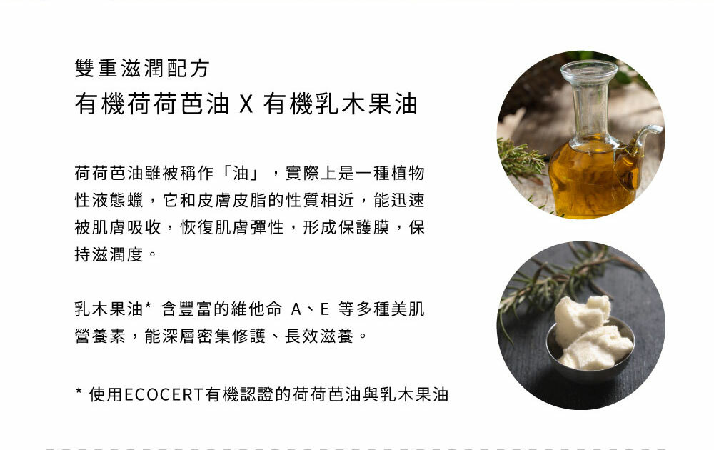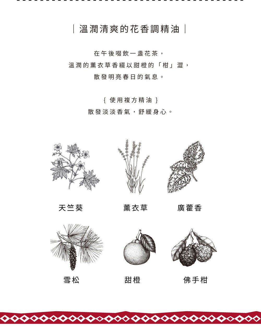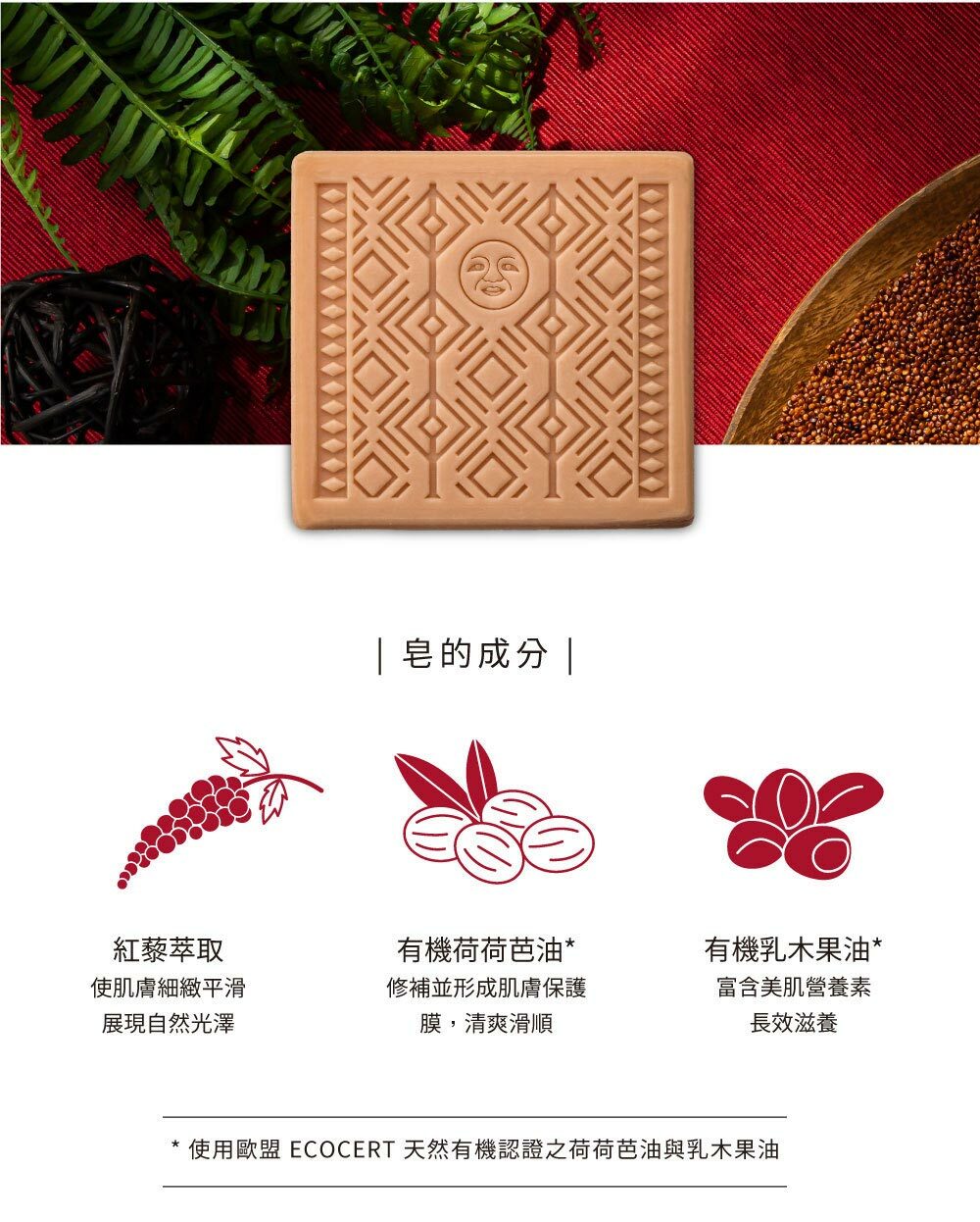 成分:棕櫚油、棕櫚仁油、荷荷芭油、有機乳木果油、紅藜萃取液、紅藜麥、複方精油(天竺葵、薰衣草、廣藿香、甜橙、佛手柑、雪松)