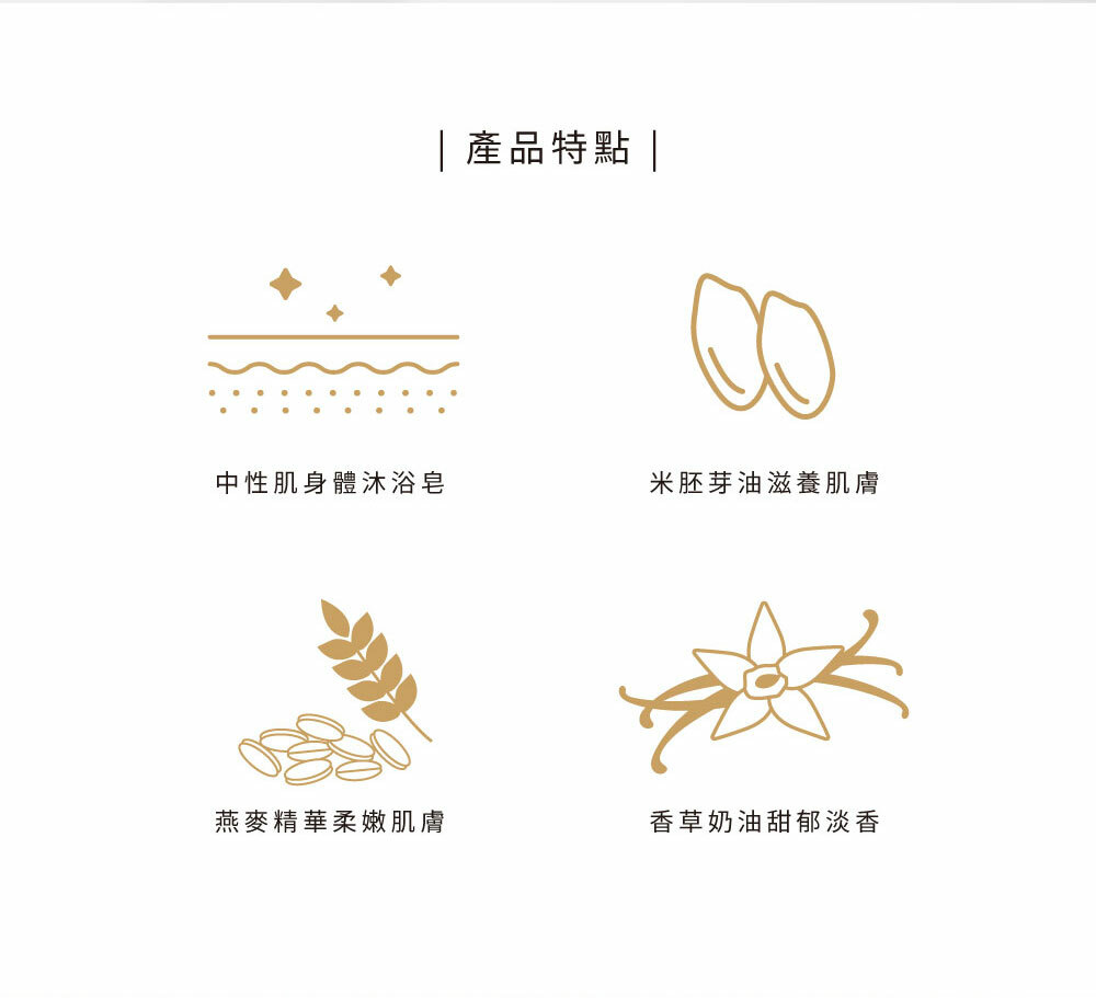 主要成分:棕櫚油、棕櫚核仁油、米胚芽油、有機乳木果油、酪梨油、燕麥精華