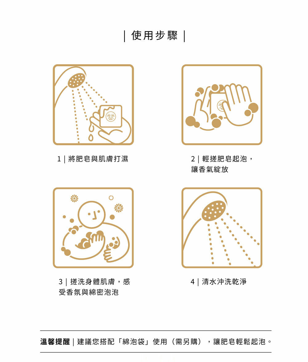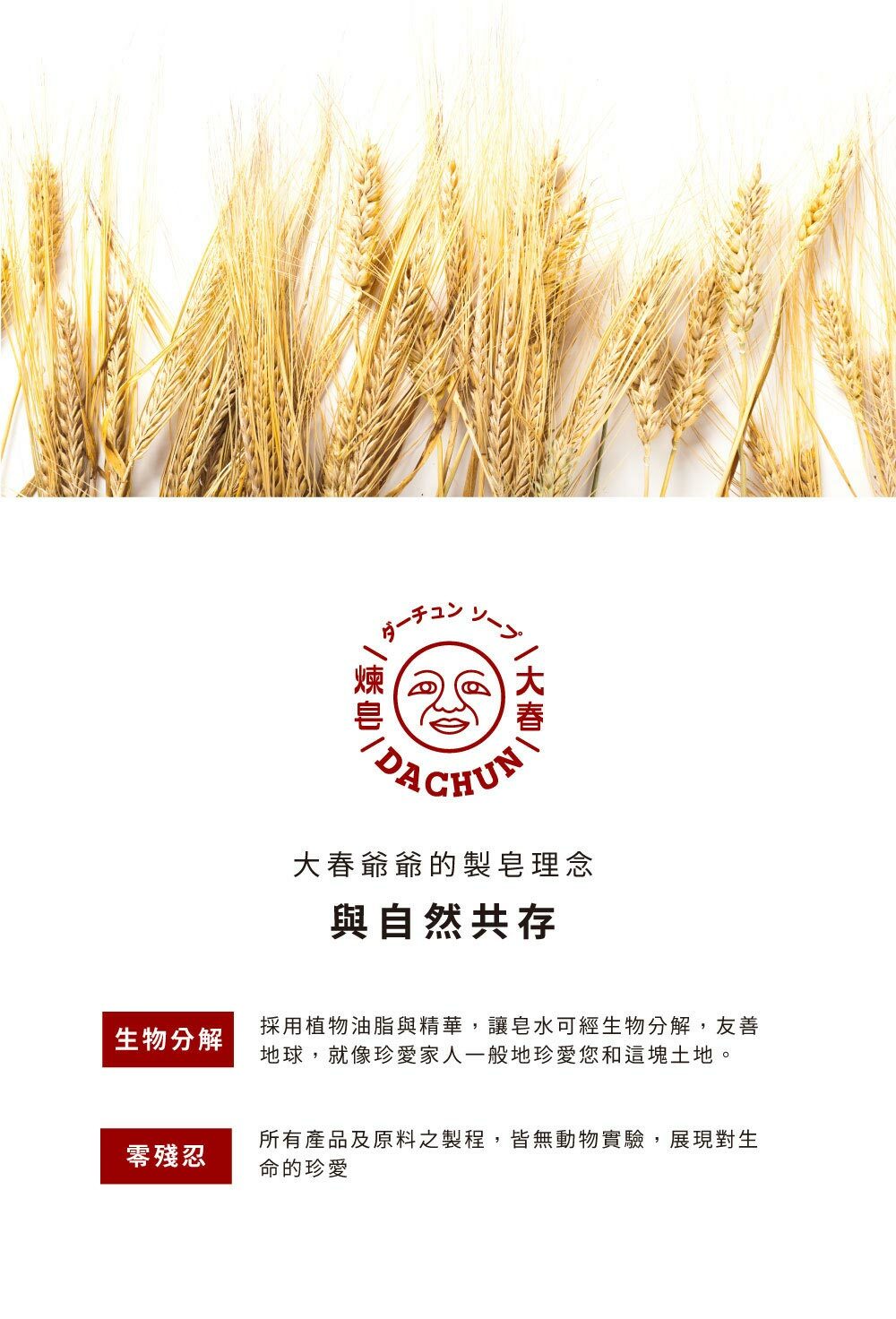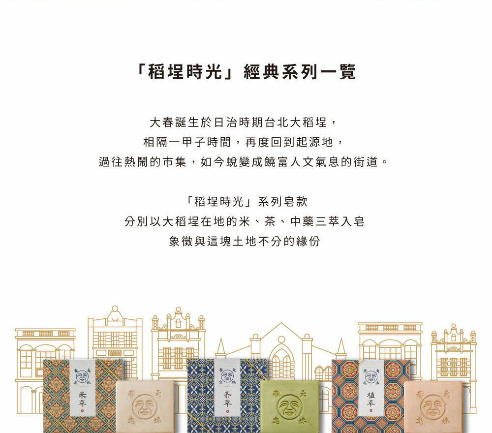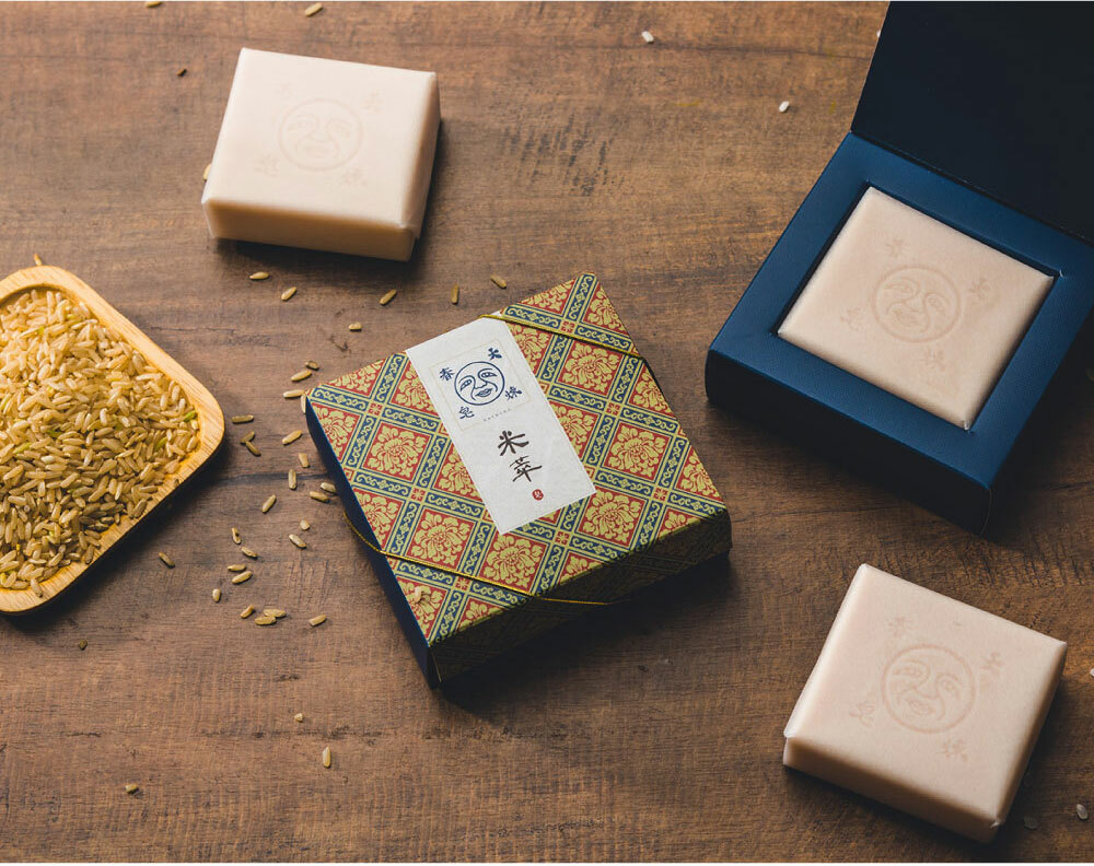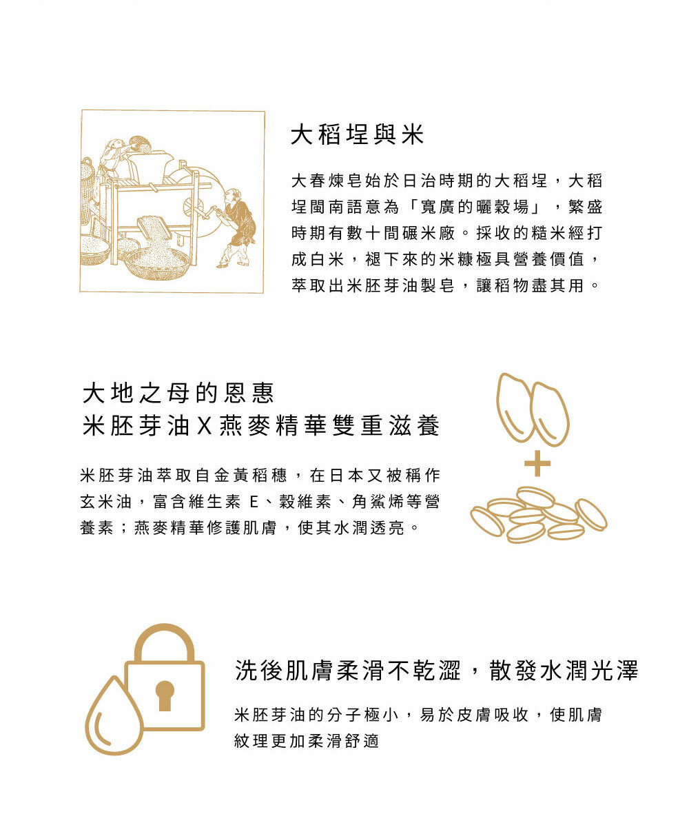 • 以大稻埕在地材料入皂,自金黃稻穗中萃取的米胚芽油,富含營養素,滋潤鎖水