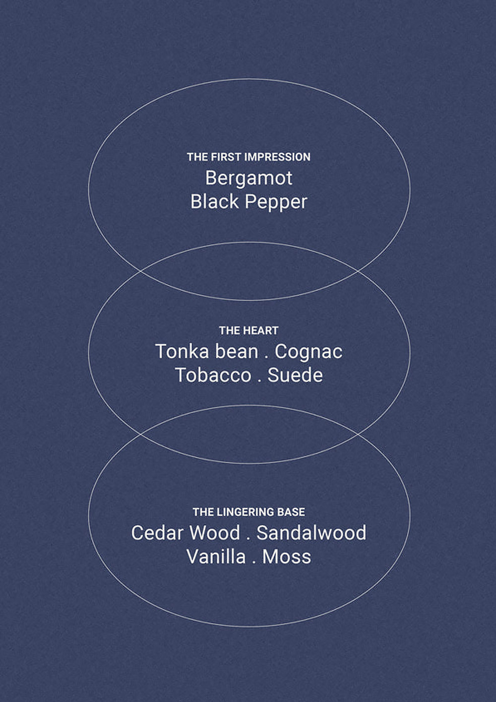 黑胡椒和甜佛手柑的奇妙組合,與皮革絨面革、煙草葉和柔滑的煙熏干邑交相輝映。