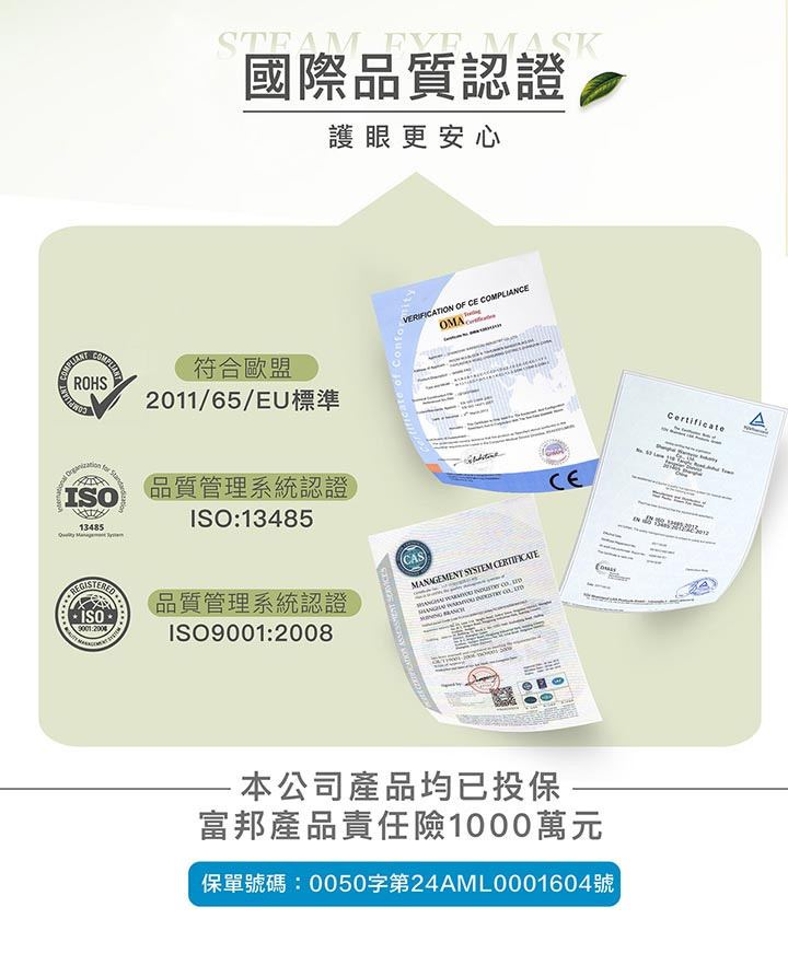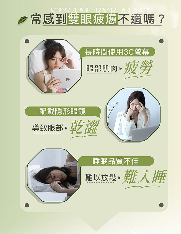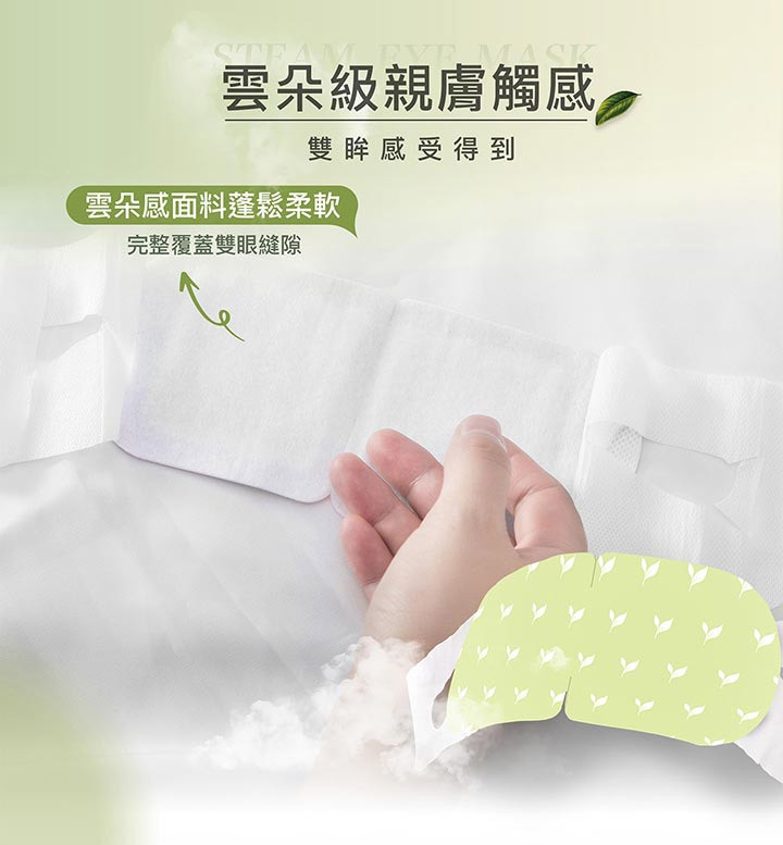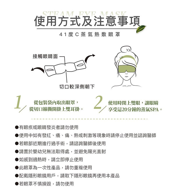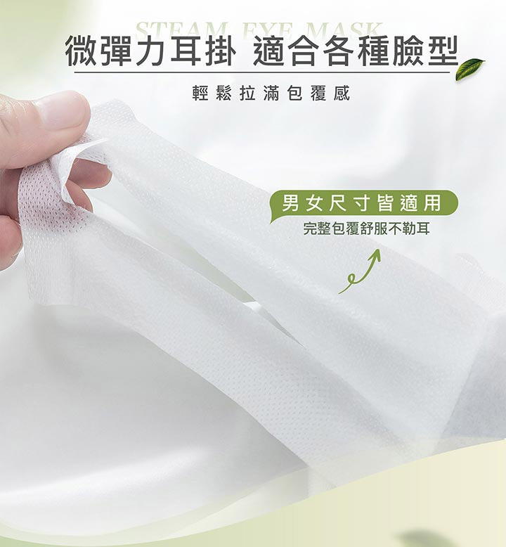 食品級活性碳、鐵粉、薄片發熱芯等,親膚棉柔不織布;從包裝袋內取出眼罩,從切口線撕開掛上雙耳掛 (切口較深側朝下);使用時閉上雙眼,讓眼睛享受這20分鐘的蒸氣SPA。