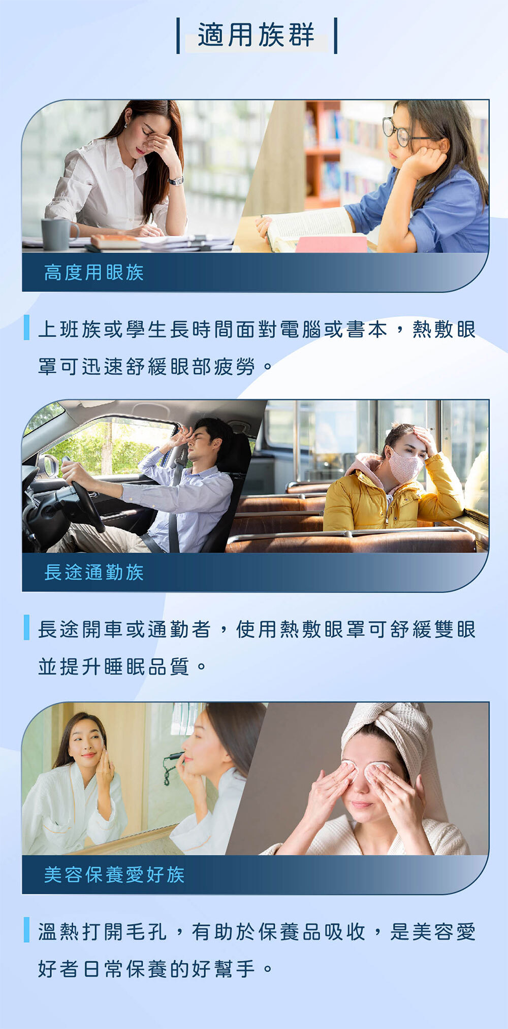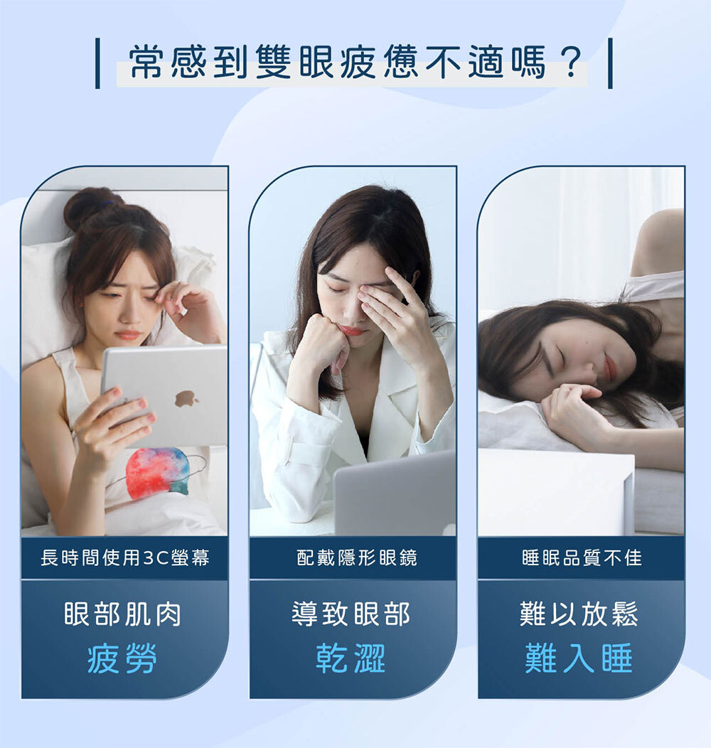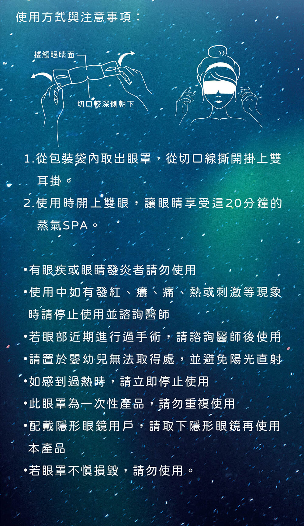 食品級活性碳、鐵粉、薄片發熱芯等,親膚棉柔不織布;從包裝袋內取出眼罩,從切口線撕開掛上雙耳掛 (切口較深側朝下);使用時閉上雙眼,讓眼睛享受這20分鐘的蒸氣SPA。