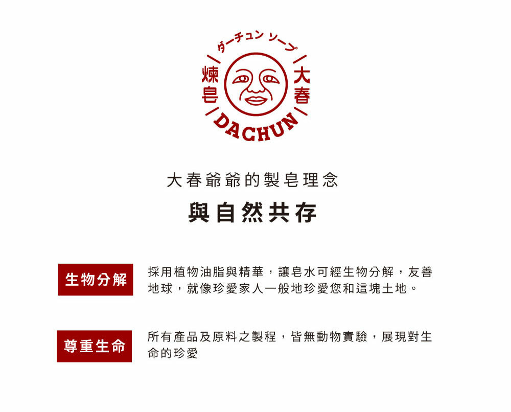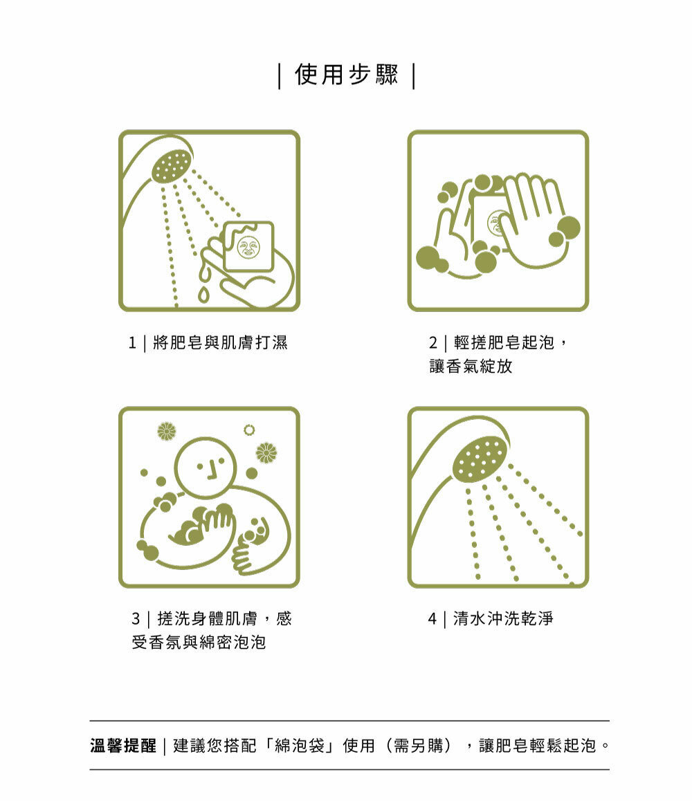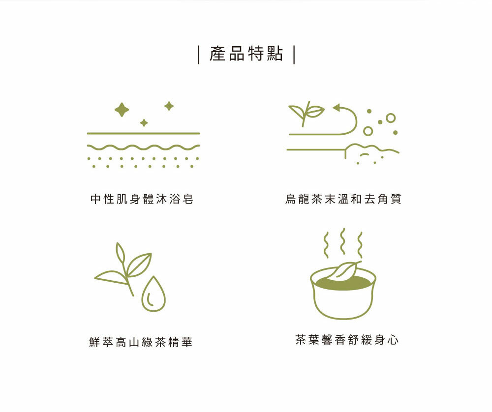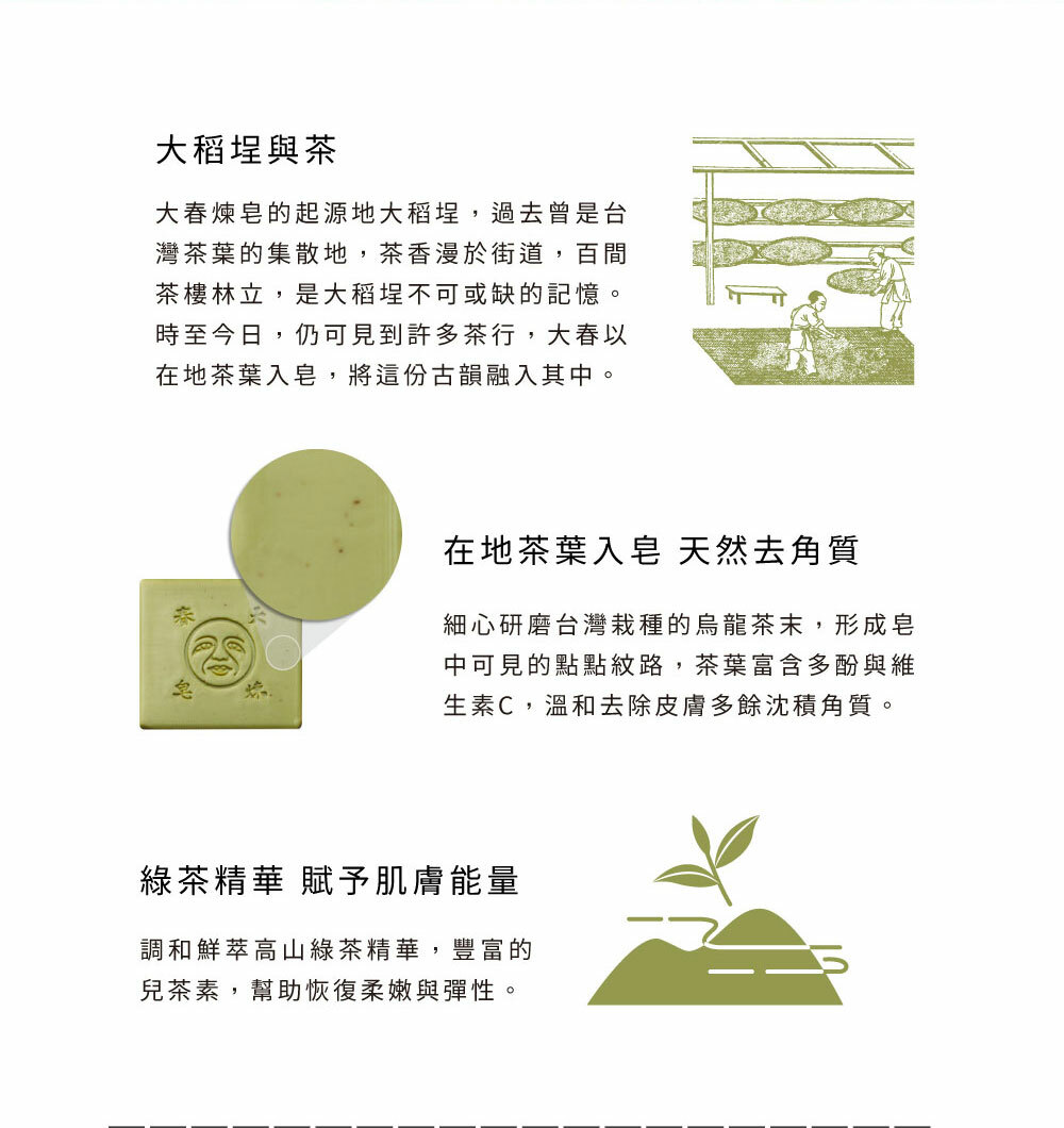 • 以大稻埕在地材料入皂,細磨台灣栽種的烏龍茶末,溫和去角質