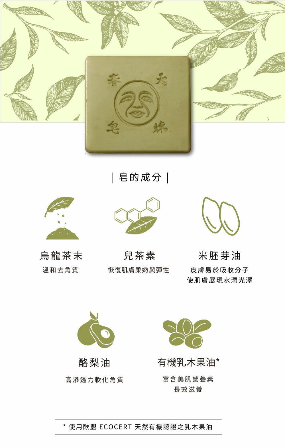 成分:棕櫚油、棕櫚核仁油、米胚芽油、有機乳木果油、酪梨油、茶粉、綠茶萃取