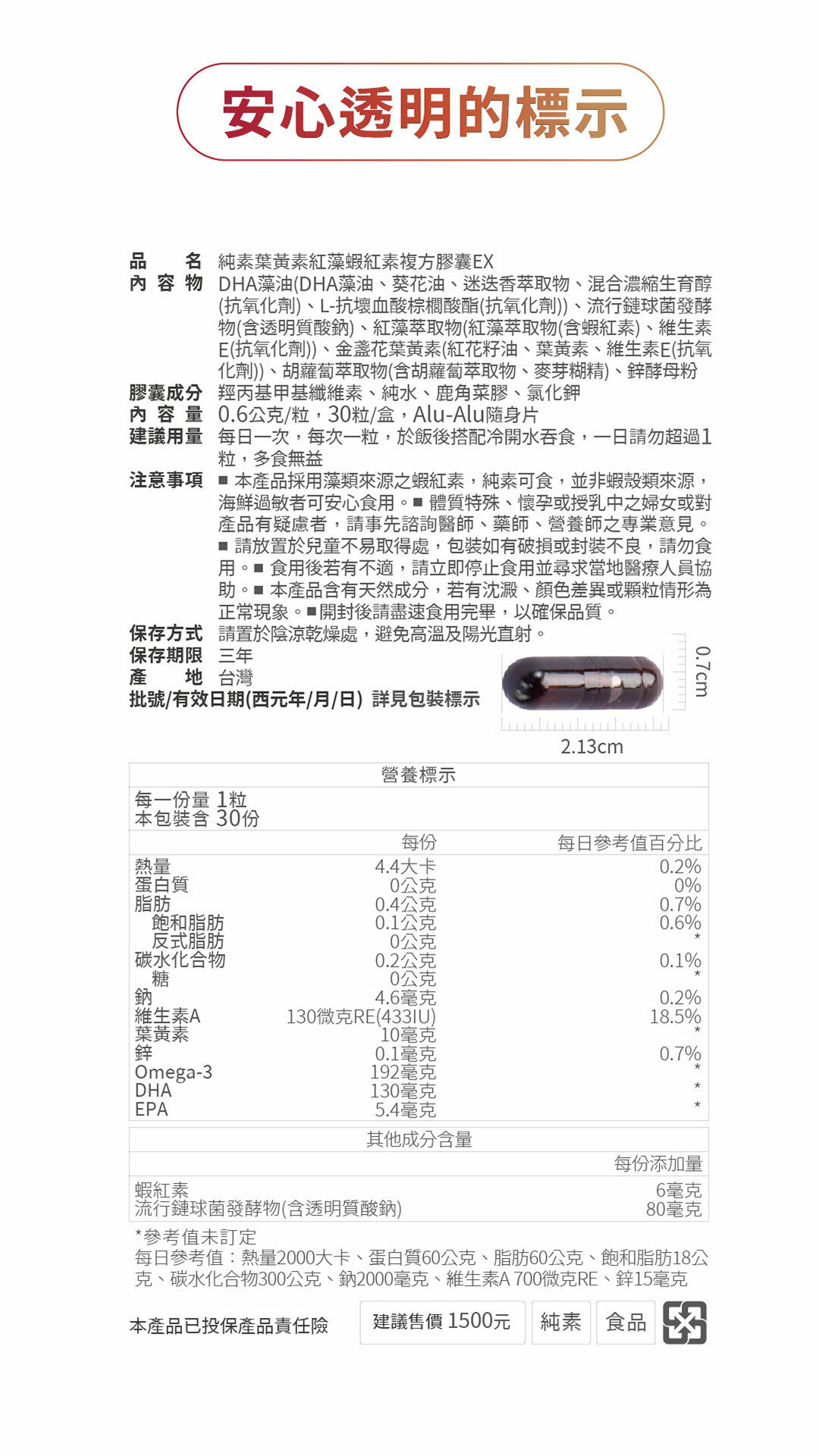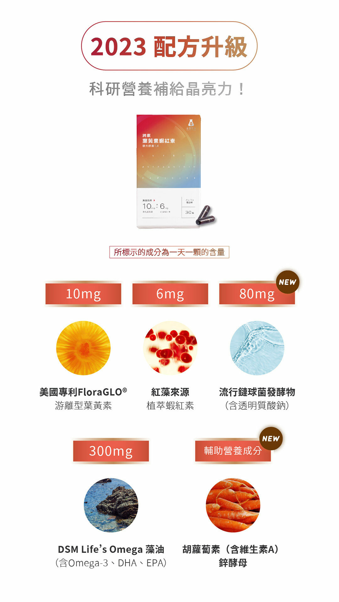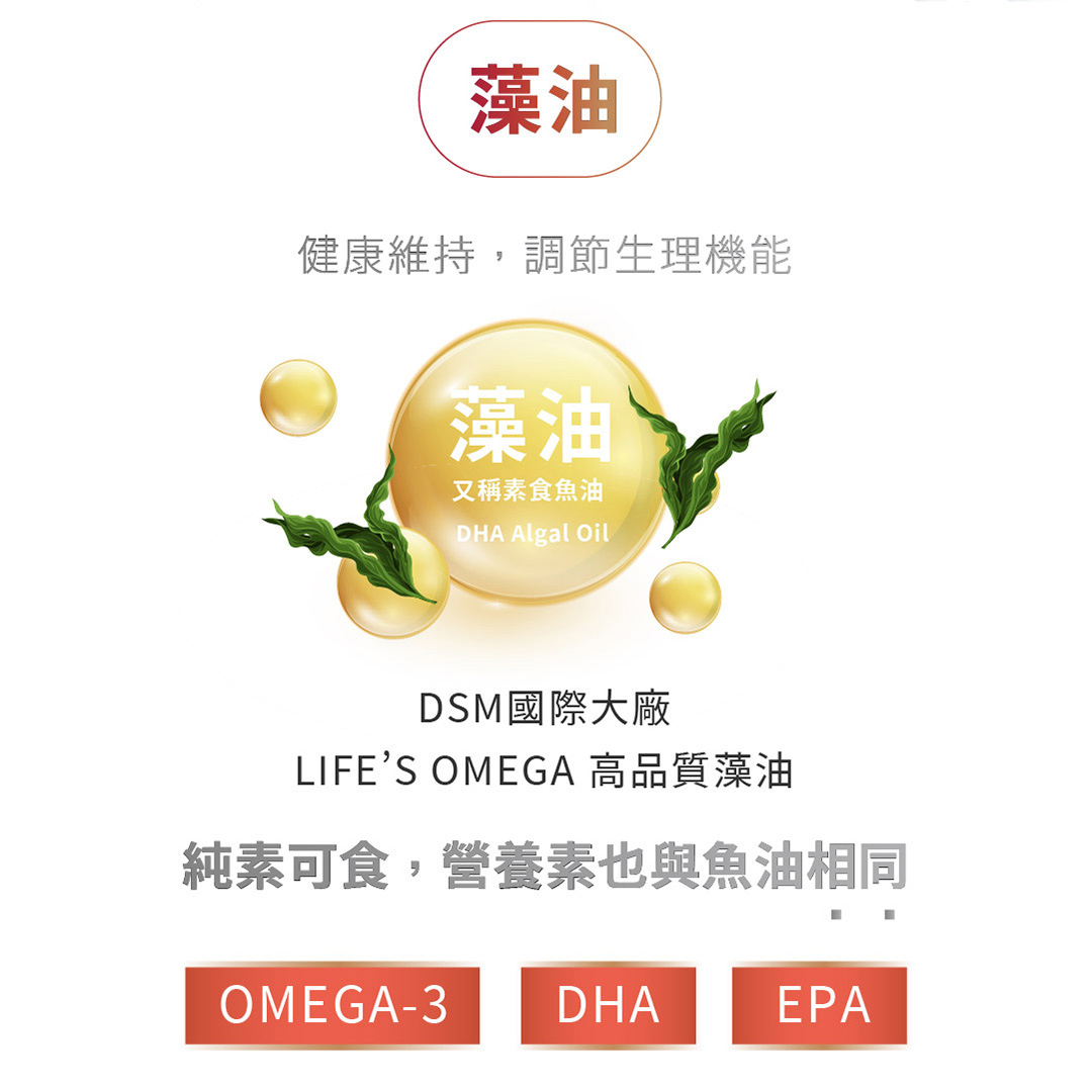 DHA藻油(DHA藻油、葵花油、迷迭香萃取物、混合濃縮生育醇(抗氧化劑)、L-抗壞血酸棕櫚酸酯(抗氧化劑、流行鏈球菌發酵物(含透明質酸鈉)、紅藻萃取物(紅藻萃取物(含蝦紅素)、維生素E(抗氧化劑)、金盞花葉黃素(紅花籽油、葉黃素、維生素E(抗氧化劑)、胡蘿蔔萃取物(含胡蘿蔔萃取物、麥芽糊精)、鋅酵母粉膠囊成分 經丙基甲基纖維素、純水、鹿角菜膠、氯化鉀 。