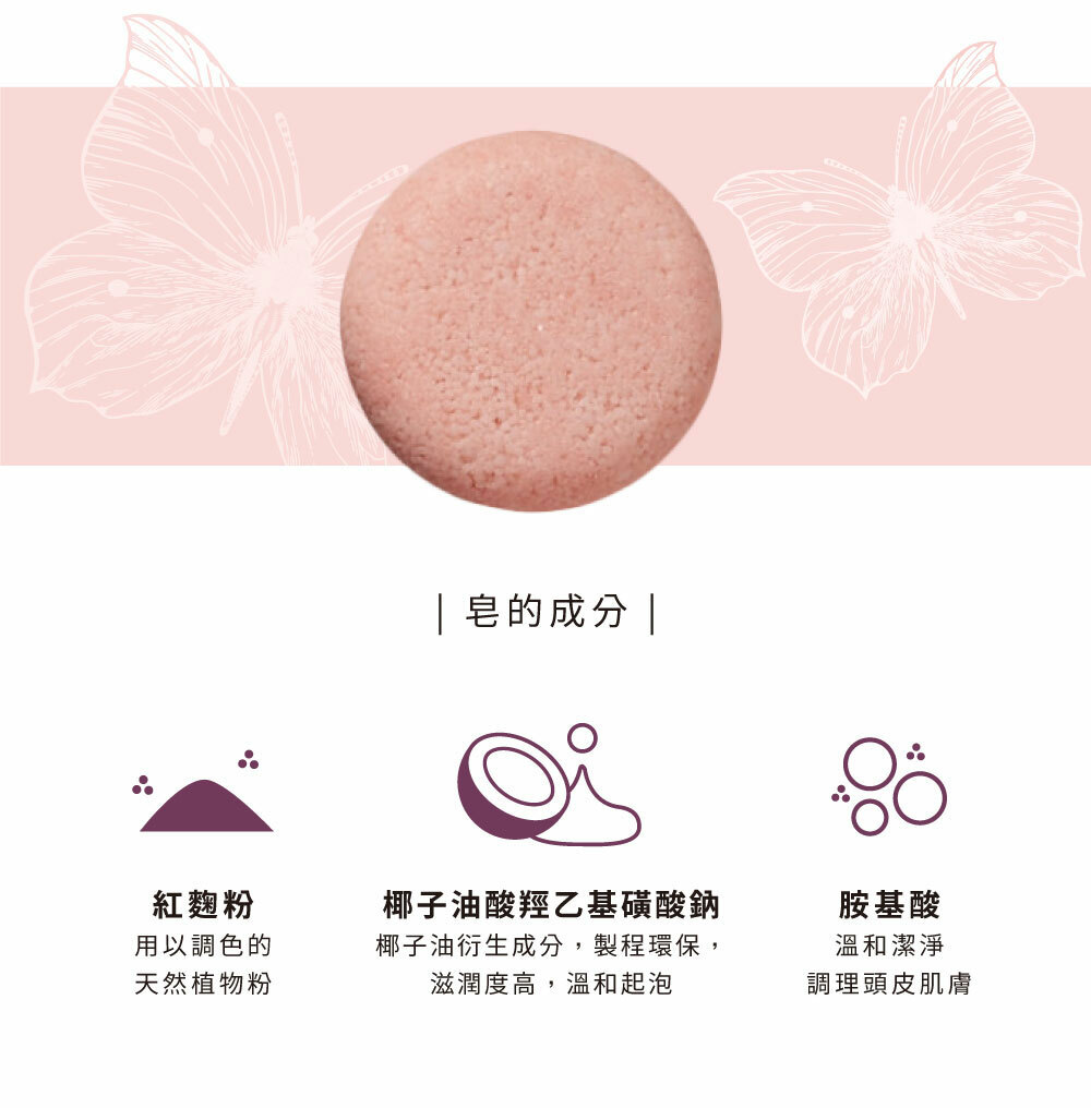 成分:椰子油酸羥乙基磺酸鈉、玫瑰果油、堅果油、山茶花油、紅麴粉、胺基酸