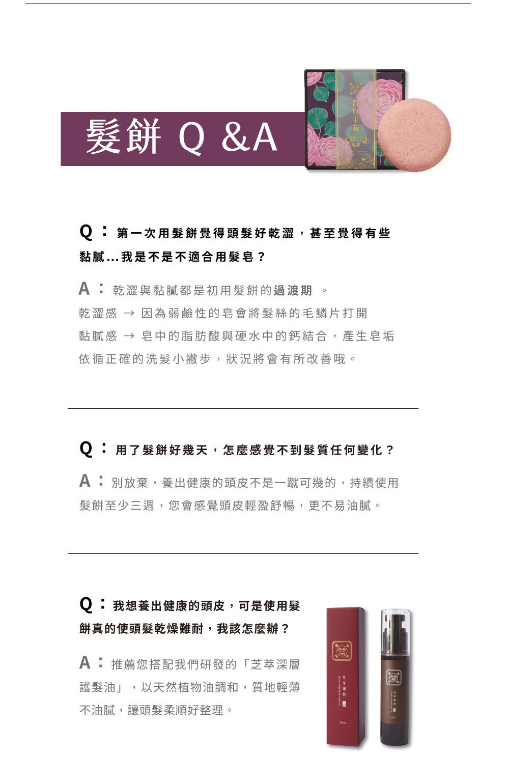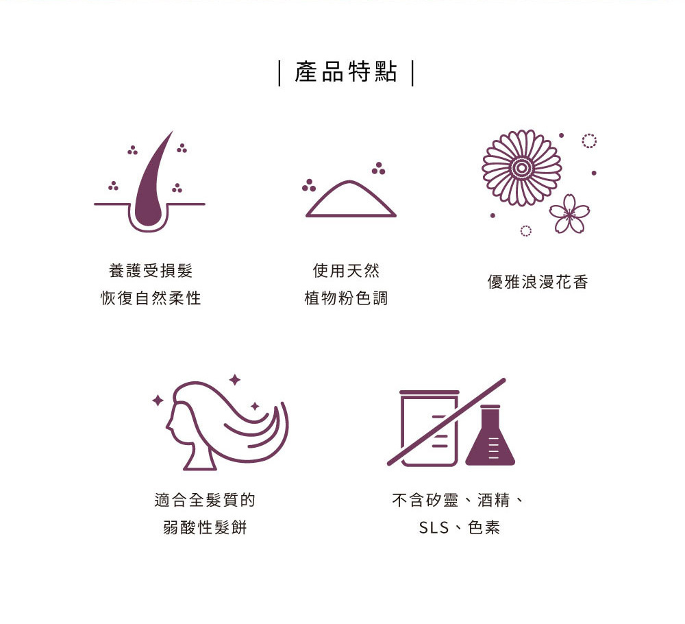 • 適合全髮質的弱酸性髮餅,給予頭皮零負擔
