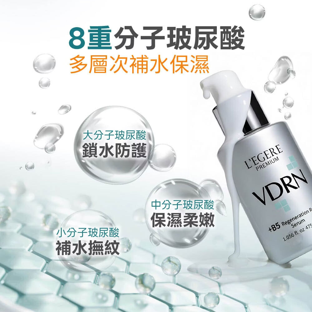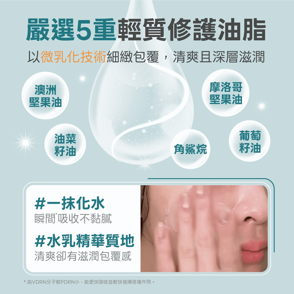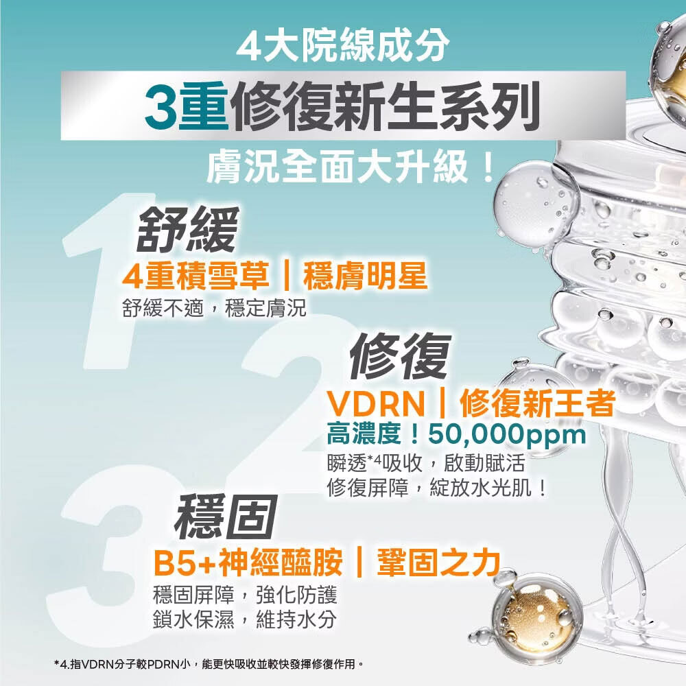 VDRN B5修復新生系列成分溫和,無添加酒精、香精、Parabens防腐劑...等12大刺激性成分,適合各年齡層、各類膚質、敏弱肌均可使用。