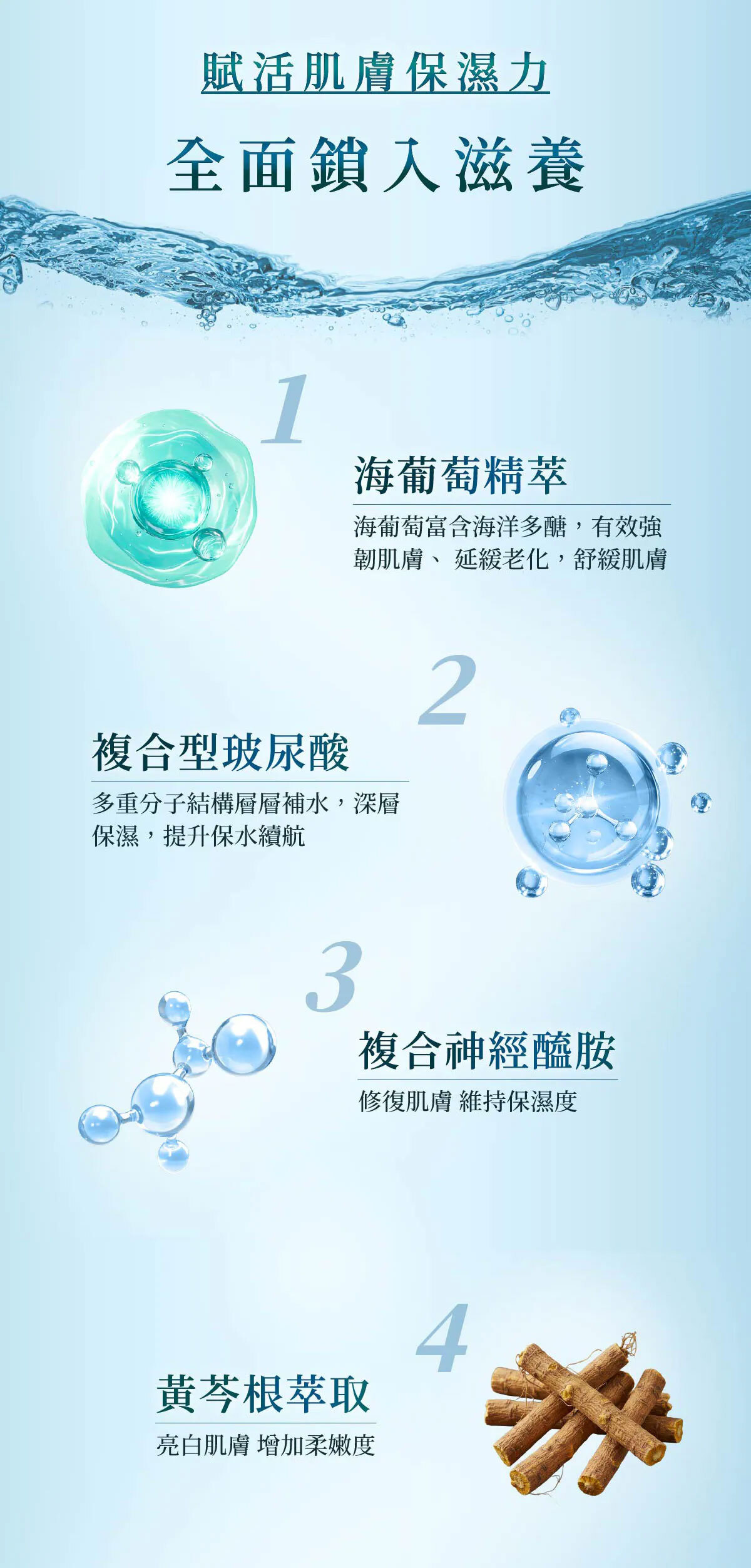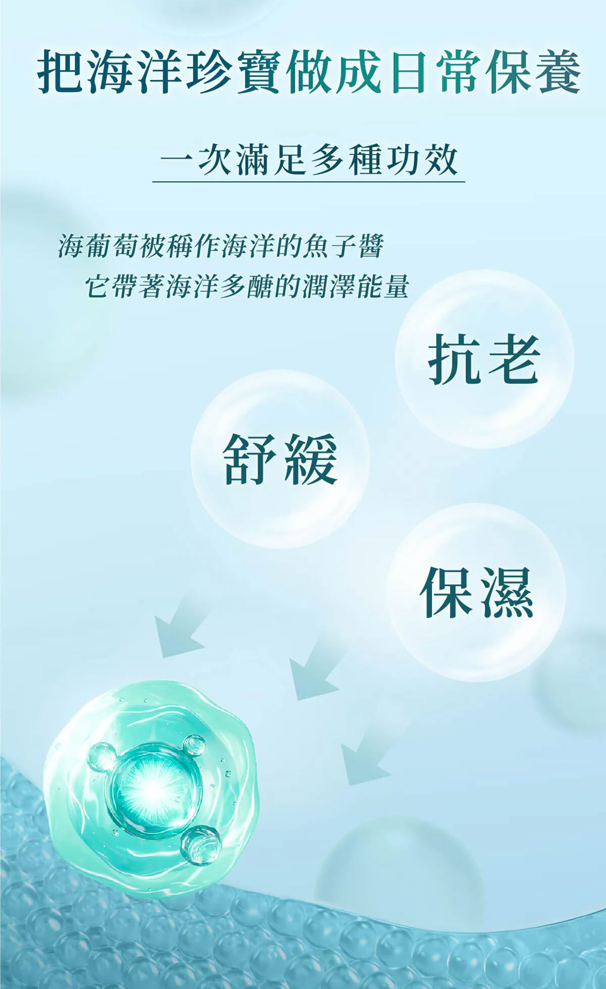 注入高效保濕海洋能量精華,釋放嬌貴海葡萄菁萃,可有效提升肌膚飽水潤澤度,一抹開啟肌膚保養生機,啟動前導賦活能量,將後續滋養全面鎖入,賦予肌膚極致感受,無瑕可擊。