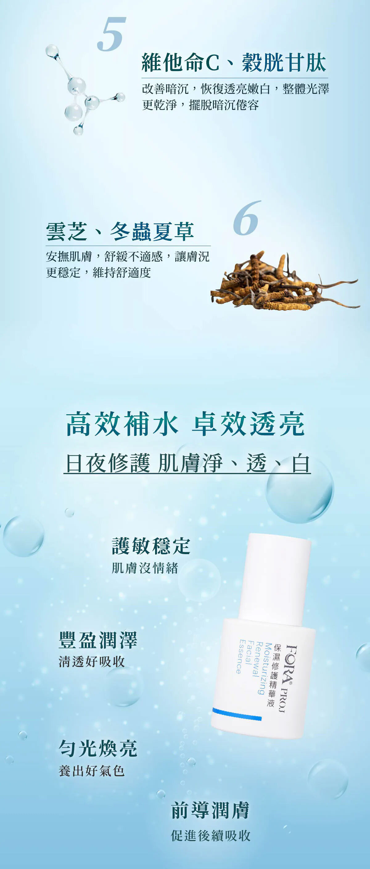 用法:使用化妝水後,取適量精華液輕拍塗抹於肌膚至吸收即可